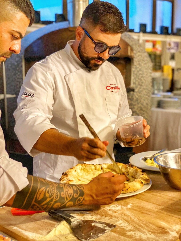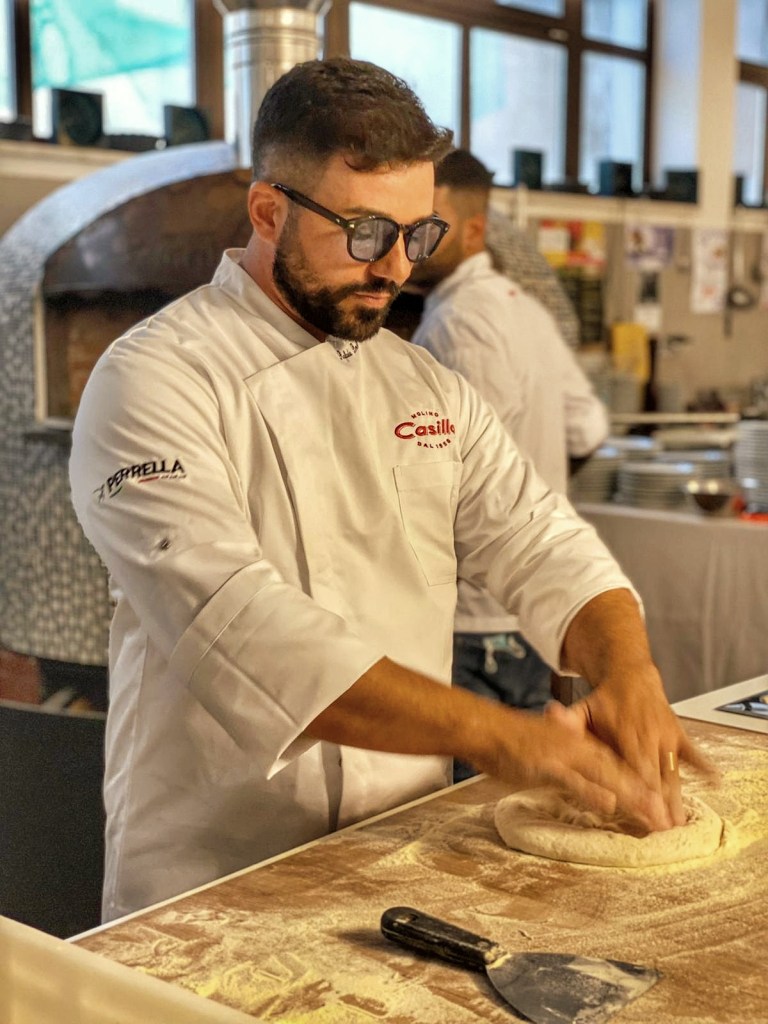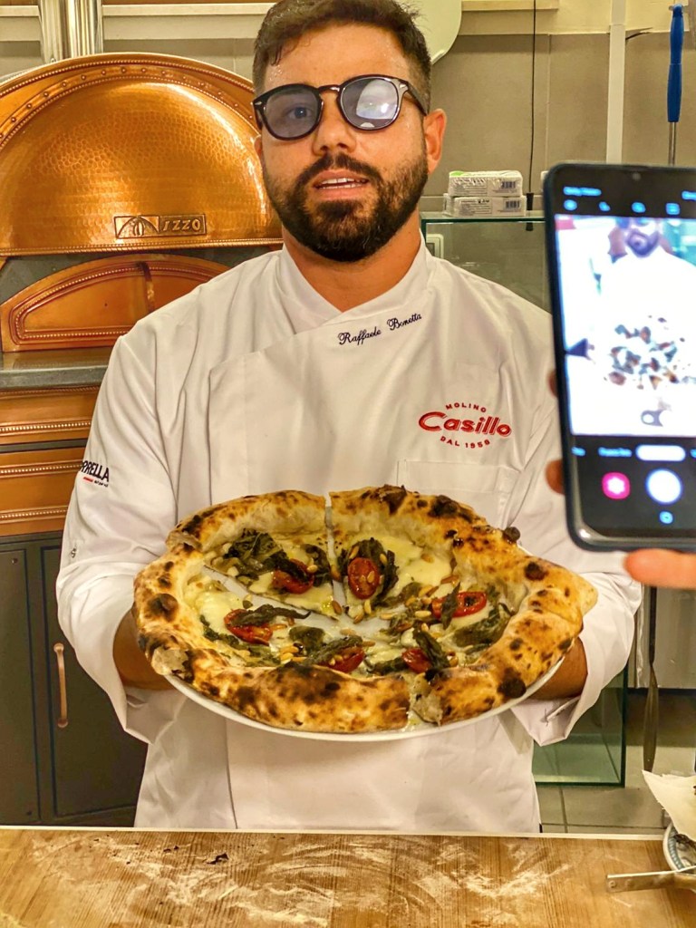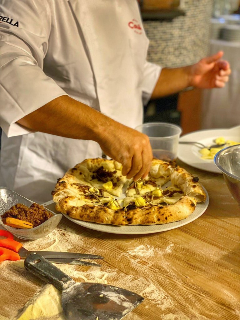 Il maestro Raffaele Bonetta presenta un blend che accarezza la Contemporanea: 8 con Germe di Grano, farina di grano tenero di tipo “0” con germe di grano, e 8 Plus, indicata per le idratazioni spinte. Gli alveoli del cornicione sono diffusori di aroma di mulino, del lavoro del mugnaio, di profumo di buono. Pasta saporita e soffice come un abbraccio, cottura centellinata affidata al maestro Ciro Casale. E Raffy non lesina mai la maestosità della sua fantasia associata alla semplicità delle materie prime dai sapori ancestrali. Fiordilatte mosto bufala, acciughe del Cantabrico, burro di Normandia, crumble di farro e segale marinato, tartufo nero uncinato. Un ricordo di bruschetta ode ai cinque sensi. Ultimo gioco per il palato la pizza con scarola, pinoli tostati, pomodorini e borragine fritta. Un sapore di terra, di casa, di famiglia, pizze che vivono di letteratura proustiana.