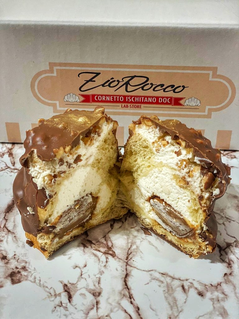 Impalpabile impasto brioche pandoro con il 15% di farina di nocciole viscianesi. All’interno un cremoso di latte e panna al mascarpone, micro cuore di cioccolato bianco bruciato al fior di sale. In superficie copertura extra di cioccolato a latte e granellone croccante di nocciole tostate. Infine sfumature di oro in polvere commestibile 23kt.