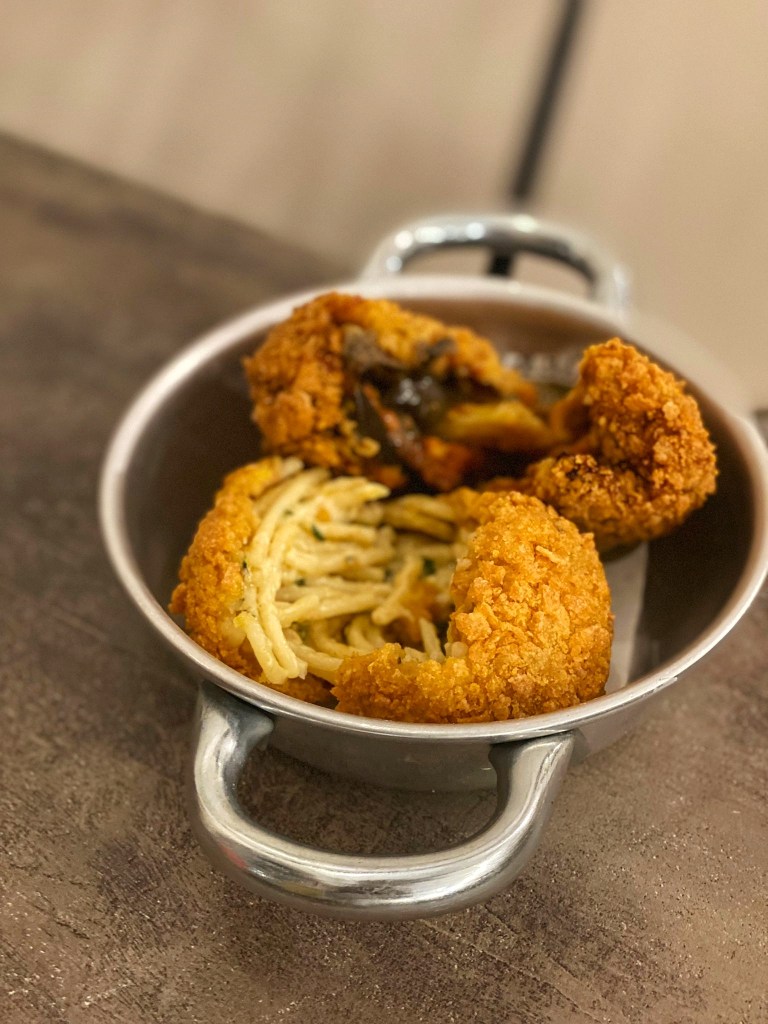 Fritti originali, le ricette diventano impanate e croccanti. Aglio e olio Croccante vincente, aglio e piccantezza presenti; Parmigiana Croccante che sa di casa e il crok che trambusta crea dipendenza. E tutto scintilla senza il minimo unto.