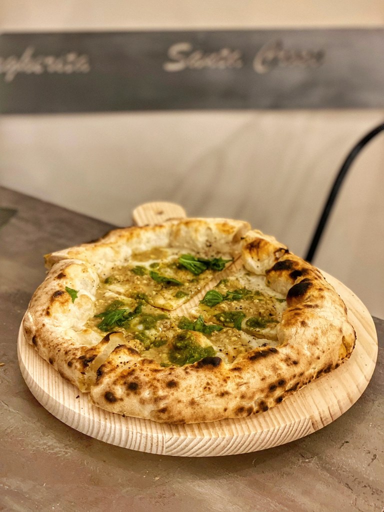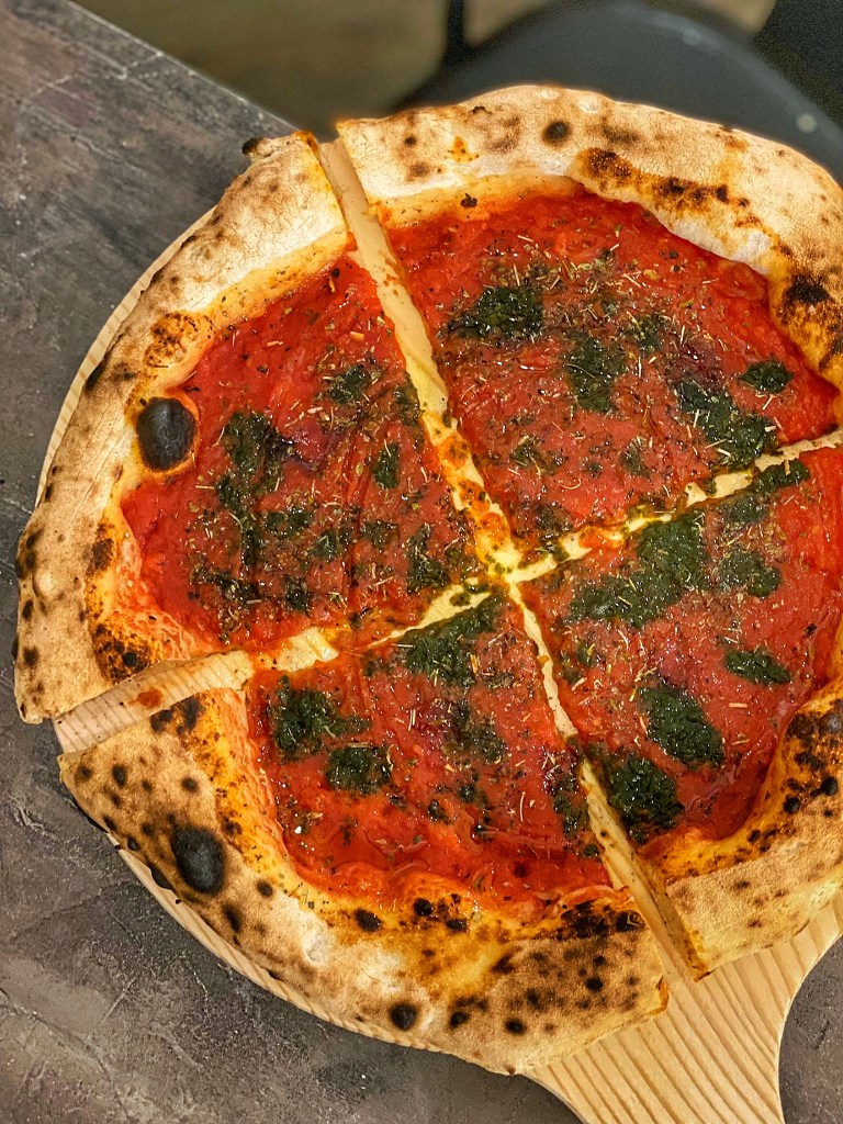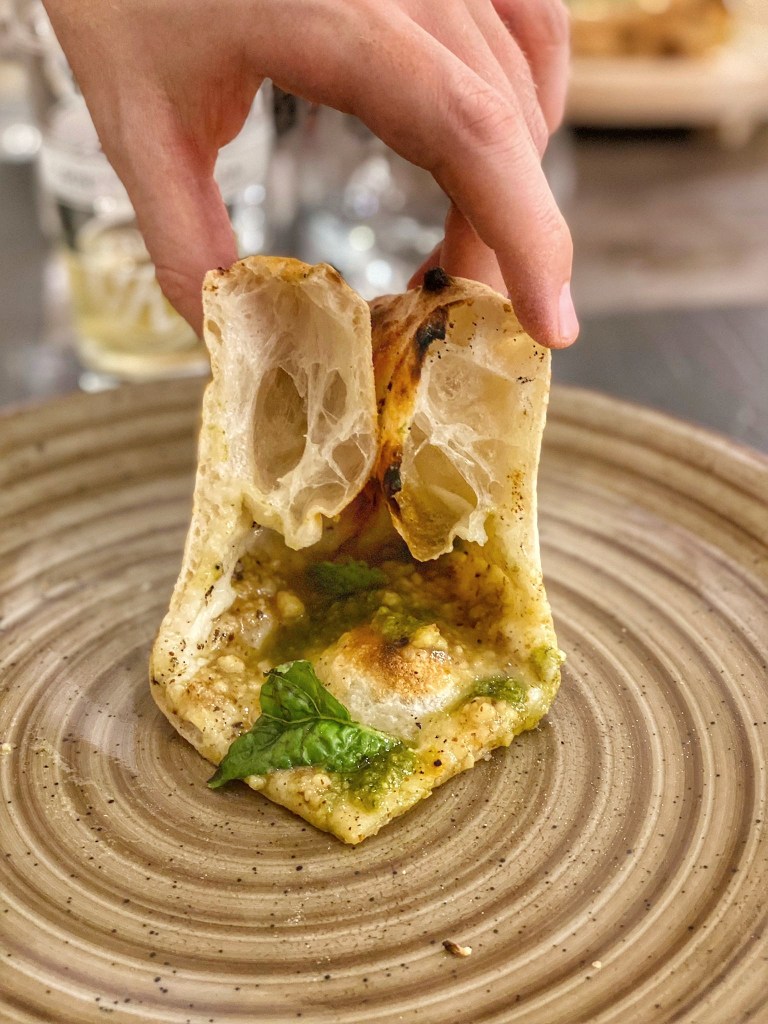 Pomodoro San Marzano DOP, pesto di aglio orsino, confettura di pomodoro San Marzano DOP, origano del Matese, olio extra vergine d’oliva. I cornicioni diventano maniche di camicia con cui pulirsi la bocca, ma ci si sporca le mani anche prima per inzupparci l’anima. Aromaticità estrema, un sapore atavico che si tinge di modernità con la dolcezza eterea della confettura. Ogni ingrediente è al suo posto, e al posto giusto, con l’impasto che non arrossisce di fronte alla proposta dalla morfologia partenopea ma che diventa co-protagonista. Dio esiste.