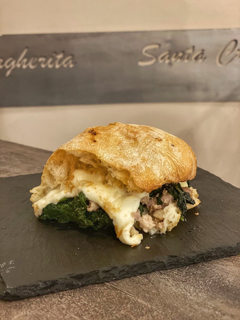 Per la Ciabatta con friarielli saltati in padella, salsiccia sbriciolata di maialino nero affumicata e provola di Agerola, l’impasto cambia d’abito, si idrata fino al 95% e fa crunch! La “marennella” universale, povera ma ricca, caciarona e spocchiosa ma manifesto roboante della versatilità del padrone di casa. “Eau de grain” le parfum magique…