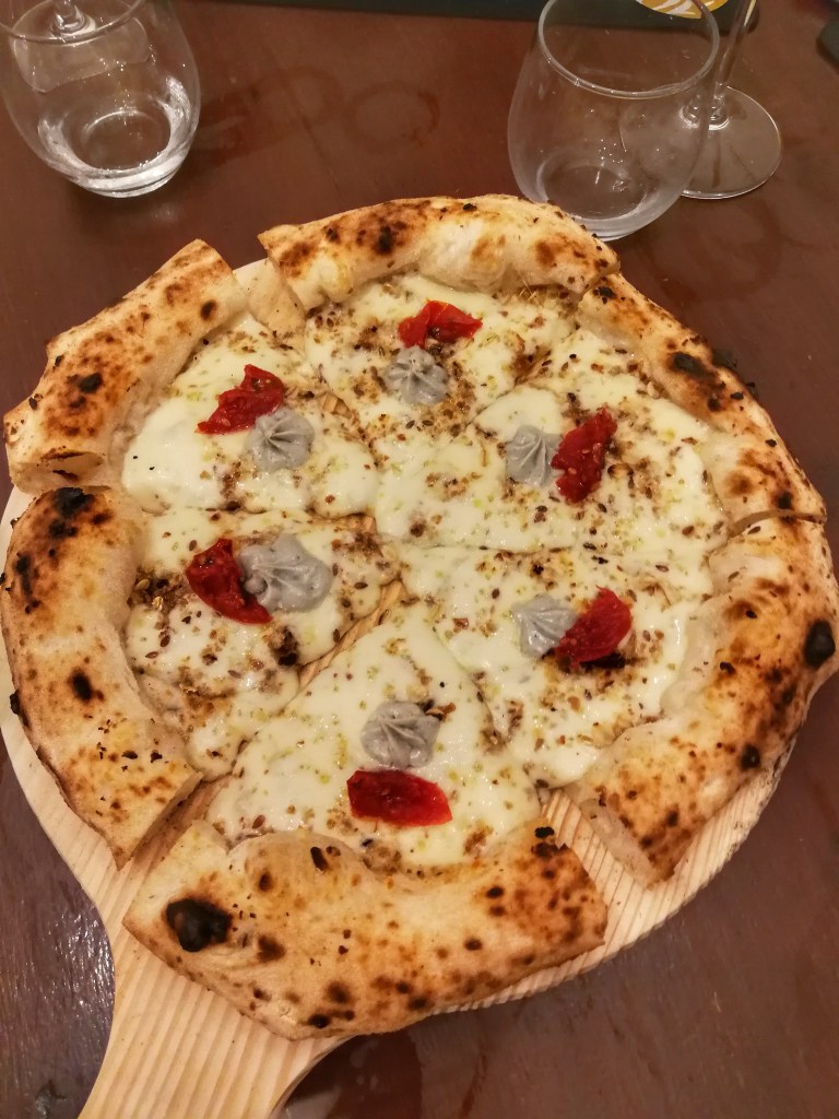 Tra Terra e Mare a bordo del suo impasto profumato e scioglievole si sta da dio… L’amaro dei friarielli napoletani saltati in padella, la dolcezza del fiordilatte d’Agerola, la fresca cremosità della maionese a limone, il sapore deciso e ricco di sapidità della bottarga di tonno, il crok delle nocciole tritate. Completa.