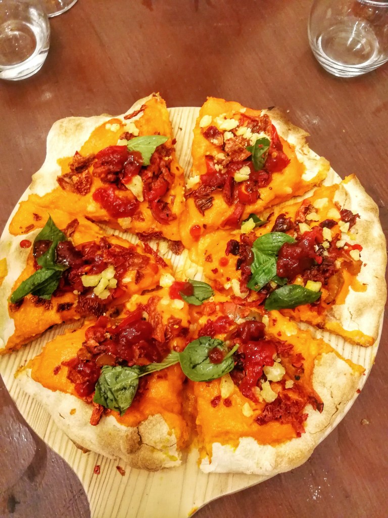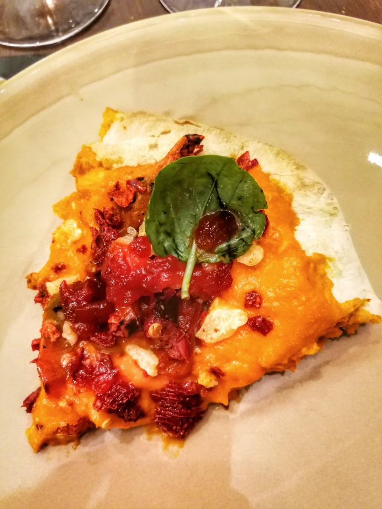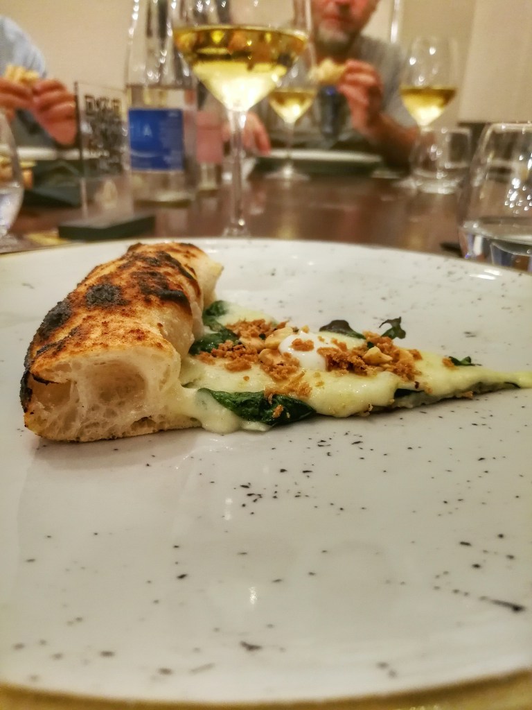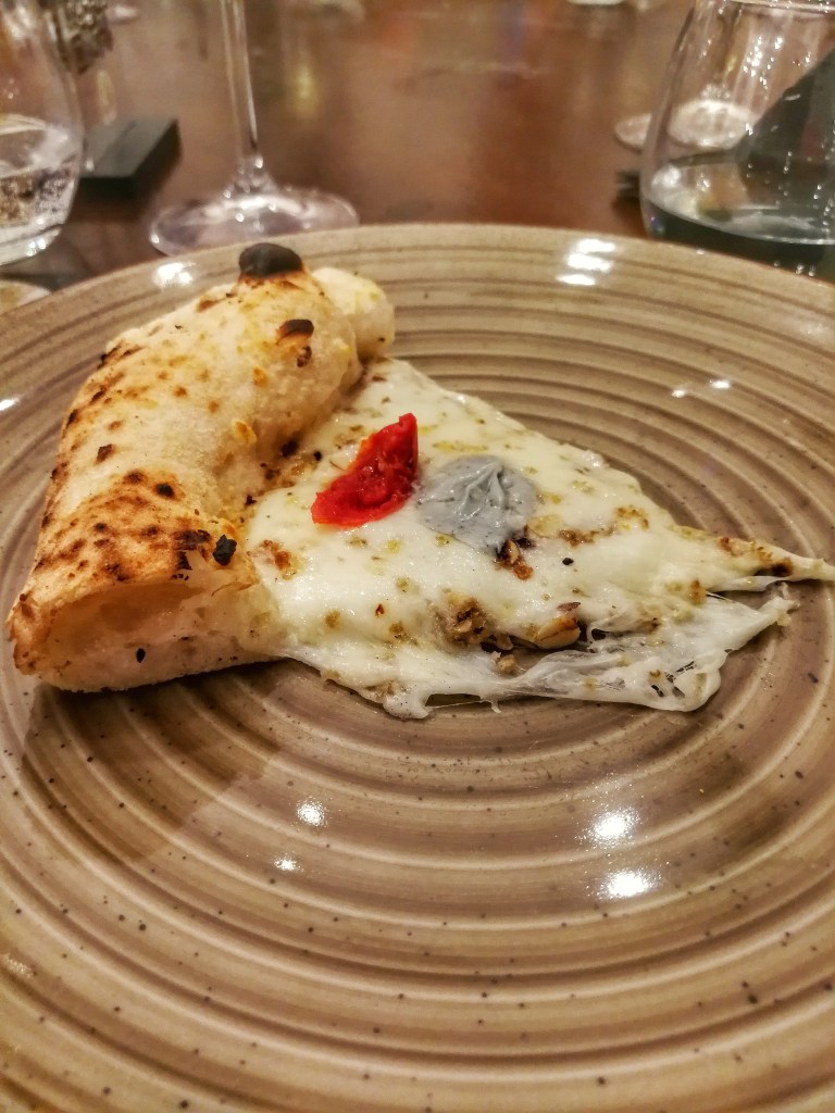 Alla fine, poi, uno si deve arrendere al piacere. E così arriva la pala, idratata al 92% con vellutata di peperone Corno, papacella arruscata, peperone cusco, Tuma e confettura di papacella. Acido sapido dolce nuovo. Un quadrilatero da ricercare il sapore ossessivamente. Mettici il crunch e la gioia di quando divori tutto.