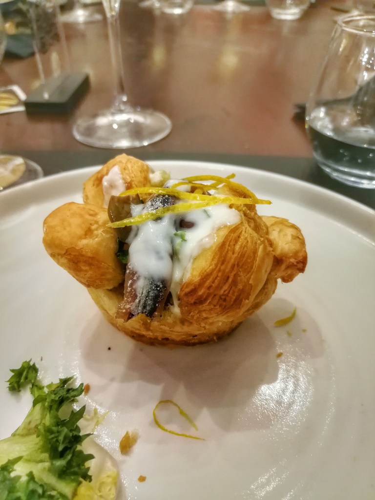 Cambio d’abito. Pane sfogliato e intrecciato con scarola riccia condita con colatura di alici, alici di Cetara, olive taggiasche, scorzetta di limone e yogurt al miele. Morbido e friabile dal suono di burro buono, servito con topping che smorza grassezza e sapidità. Matrice essenziale con spinte contemporanee. L’off topic che non è la “solita pagnotta”… Da dipendenza.