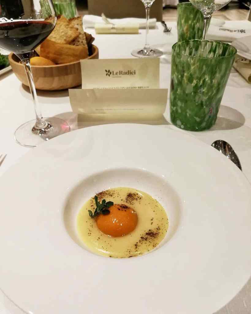 Una buona dose di estro e tecnica dello Chef Matteo Sangiovanni, direttore d’orchestra di una brigata precisa, dagli ingranaggi scanditi. E non per ultimo lo charme di una location sempre impeccabile del Ristorante Le Radici.