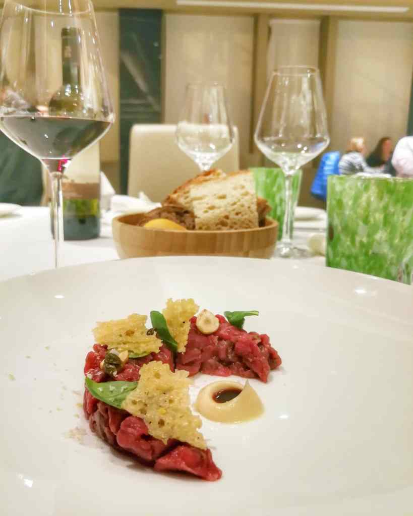 Dopo il classico gioco di prestigio del Finto uovo con sferificazione di zucca con purea di sedano rapa e finocchi, visivamente perfetto, cremosamente avvolgente, la ciccia che ti stropiccia (l’anima): Tartare di frisona con nocciole, parmigiano, maionese e salsa al vino. Sapore, superficie e consistenza idilliache. Magistrale.