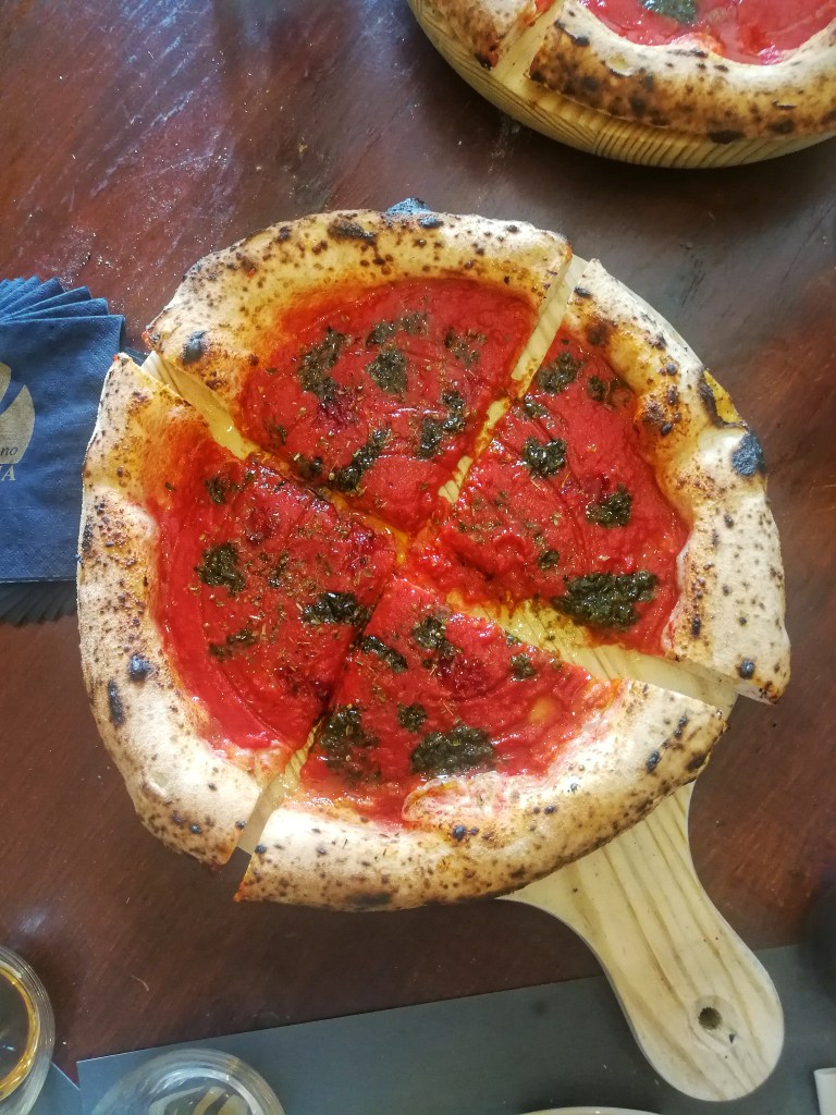 La Porcina è la passeggiata nel fantabosco: porcini, fiordilatte d’Agerola, pomodorini semidry, pestato di aglio orsino, olio extravergine d’oliva aromatizzato al prezzemolo. I funghi sono veri, odore e sapore, dolce e aromatico. Consistono e coesistono perfettamente con l’amico di bosco brioso ed elegante. La punta acida del pomodorino e l’effluvio dell’olio che permane. Indovinata.