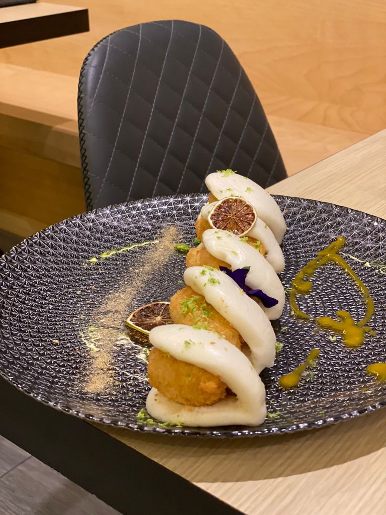 E così nel filetto di salmone marinato in acqua di pomodoro, cipolla e zenzero, accompagnato da salsa lemongrass e maionese giapponese marca il territorio la cenere di olive di Gaeta; nel taco di grano con tartare di salmone, tonno, branzino e gambero, il peperone crusco diviene il re della festa; nel Bao Mitoboru, la polpetta di gamberi abbraccia la provola d’Agerola, la confettura di fichi bacia la zeste di limone.