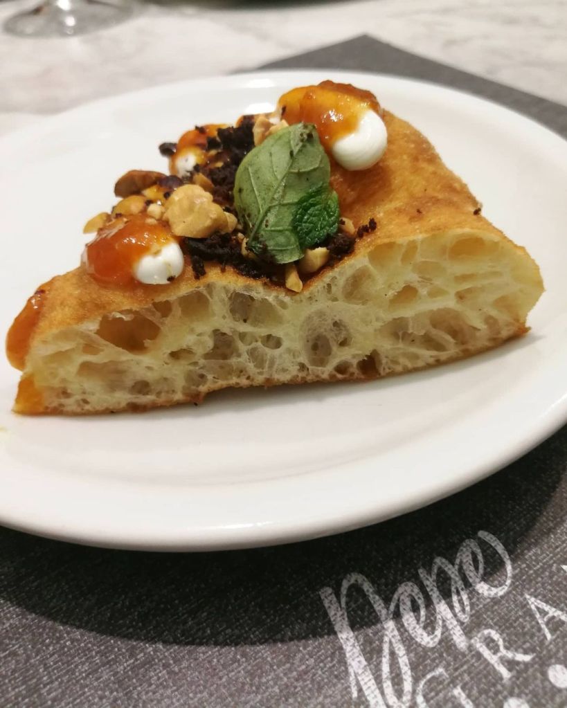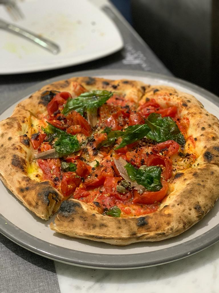 La Ritrovata di Franco ha radici strette e profonde che raccontano di sapori antichi mai scomparsi: la Marinara del suo papà che ritrova forma più nel gusto che nell’aspetto. Perché Franco è così, un tremendo visionario. La sua tradizione più che uno standard è creatività pura. Ricette senza dosi ma con tecnica e sentimento. Così sul disco di pasta, sempre più suadente al morso, due tipologie differenti di pomodori, Piennolo del Vesuvio e San Marzano passsato. A completare il racconto capperi disidratati, polvere di olive nere caiazzane, acciughe di Cetara, olio agliato e basilico fritto. C’è bellezza, intelligenza, colore, luce, essenzialità complessa. Una Marinara, anzi, una pizza eterea, quella di ieri, oggi e domani.