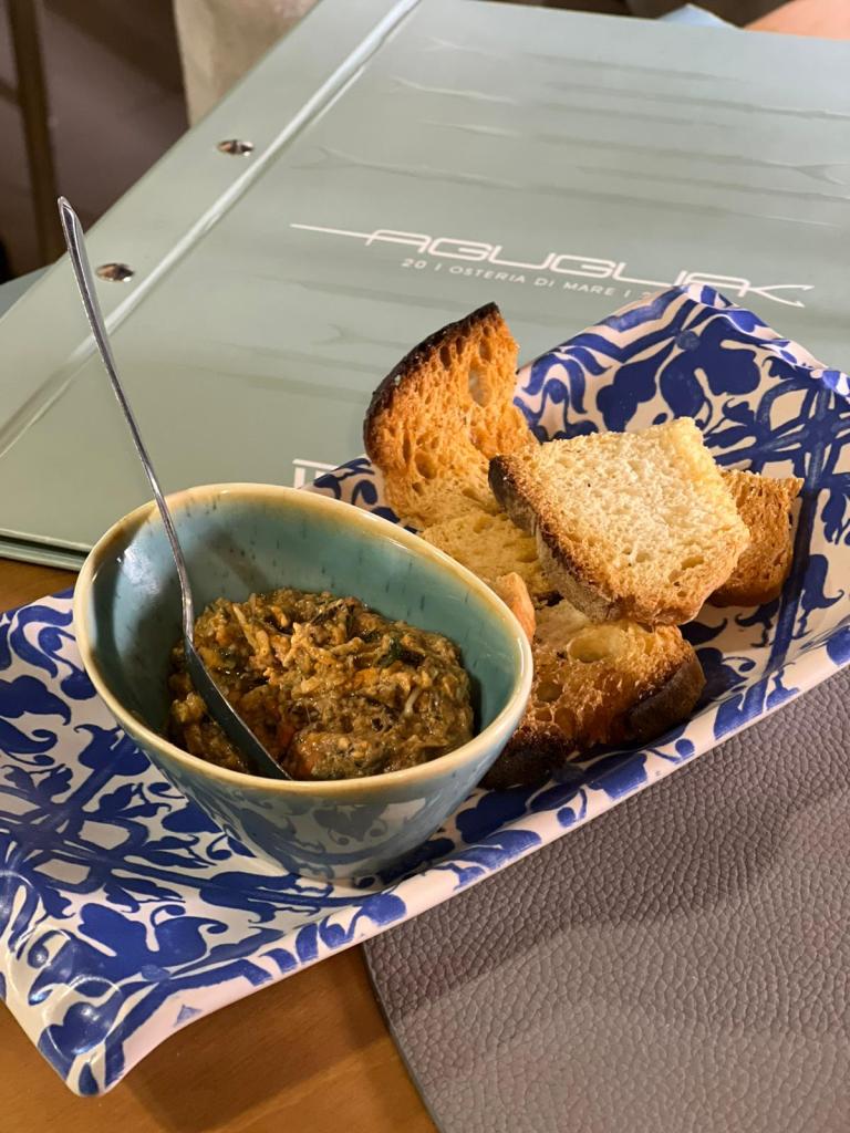 Il benvenuto si spalma su crostini di pane: il paté di cozze sa di flegreo, sapido, godurioso.