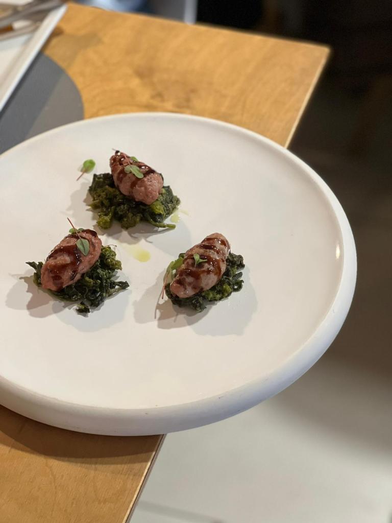 E poi tra I CALDI, proposte canoniche, tra cui orata e patate, insalatina di seppie, seppia con crema di broccoli e magnum di baccalà con crema di papaccelle, e signature più audaci. Mini bun al nero di seppia con hamburger di tonno, scamorza fritta e crema di zucca o salsiccia di tonno e friarielli?! La salsiccia è un gioco illusorio e saporito dove il bis è d’uopo.