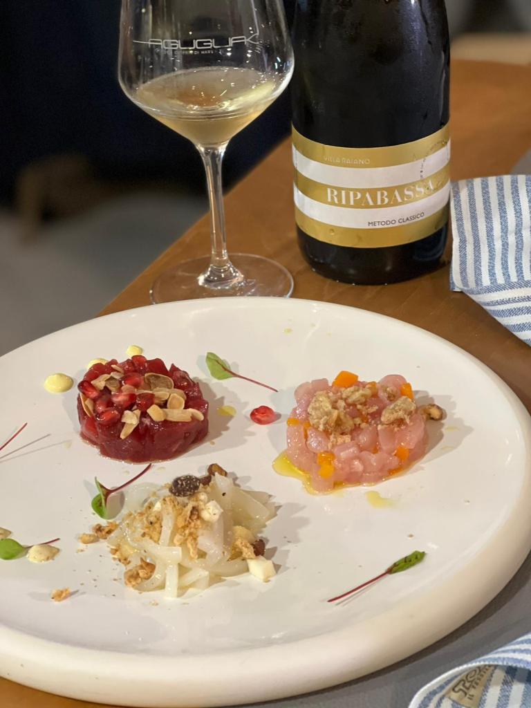 Gli antipasti spaziano tra i crudi e i cotti. Ho lasciato pezzi di cuore sul tris di tartare: tonno, mandorle e melograno; seppie, scamorza affumicata e tarallo sgretolato; orata, zucca e noci caramellate. La qualità massimo comune divisore con accostamenti che sanno il fatto loro.