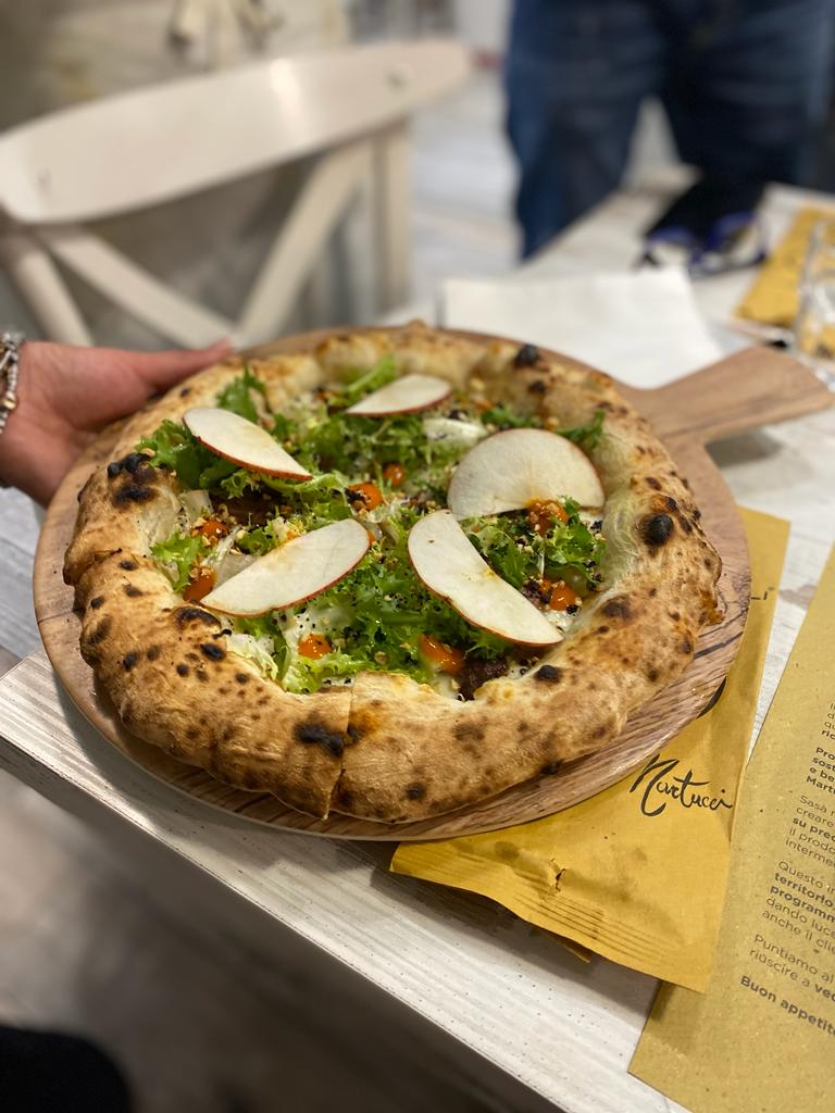 La pizza diviene, improvvisamente, piatto. Ricetta su tela, insomma: pancia di maiale di razza casertana cotta a bassa temperatura, fiordilatte di Vacca Pezzata Rossa, scarola riccia, crema di papaccelle, granella di nocciole, polvere di olive caiazzane, fettine di mela annurca. Topping da urlo che mixa le bellezze del luogo. Tutte le noti presenti, l’acidità scherza con l’umami, il crunch è lungo e la ciccia disarma per morbidezza. L’Umami di Maiale fa arrossire l’impasto.