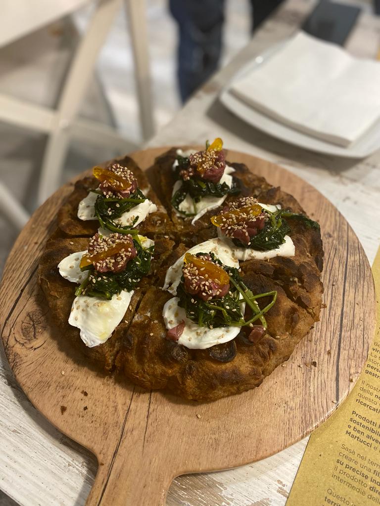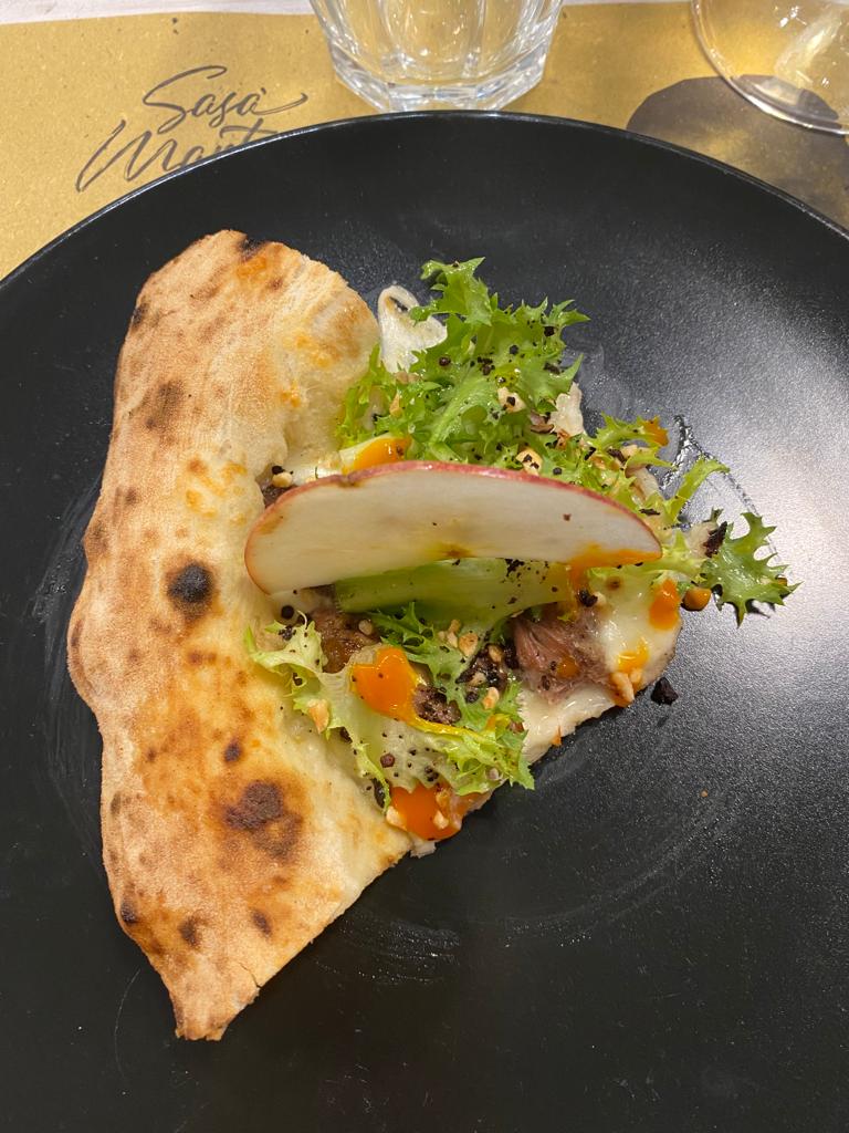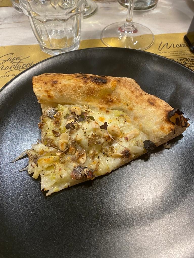 Sasà non annoia, è l’anima della serata anche dal suo banco di lavoro. La pizza contemporanea, il menù esplode di territorialità creativa, il pasticciere on demand, la carta dei vini molto naturale, il servizio molto cortese e i tavoli molto pieni.