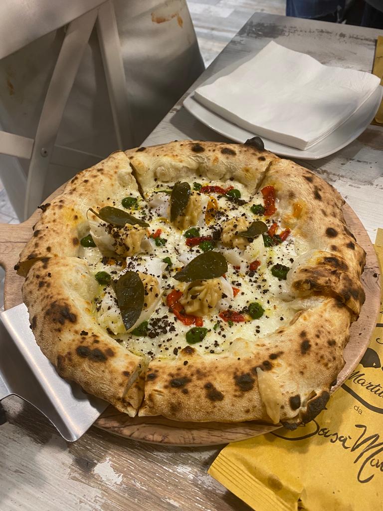 Iniziazione alle danze perfetta col picco di emozioni che si ripete con l’Ammiraglia. Rivisitazione della Marinara che diviene bi-colore e bi-consistente: crema di pomodorino giallo, pomodoro San Marzano arrostito, olive caiazzane, capperi, alici a crudo, aglio orsino, origano di montagna, olio evo. Equilibrio e aromaticità, pizza propriamente detta che esprime autenticità di intenti tra ingredienti. Da bis.