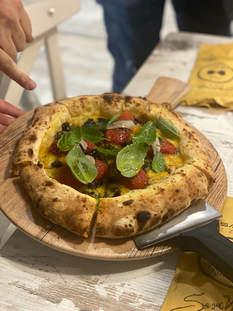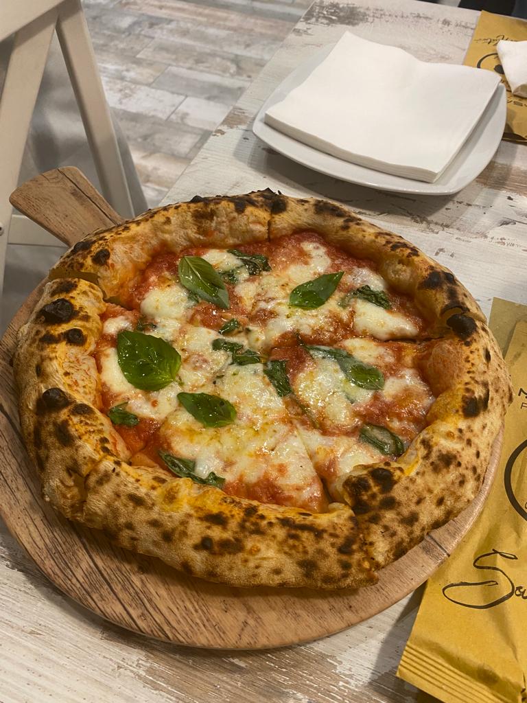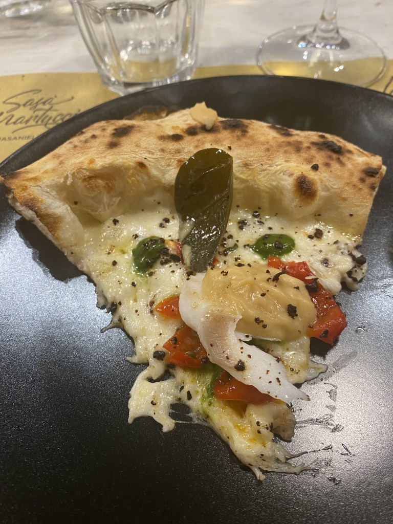Sasà traccia i confini e inventa, ricerca e crea, finanche cambiare il prefisso della Margherita: passata infornata di pomodoro riccio (biotipo locale), stracciatella di bufala del Caseificio ABC, giro di olio extravergine EVO fruttato medio a marchio “Sasà”. Margherita Casertana con lo 0823. Dolcezza e cremosità, delicatezza elegante con texture molto figa. Apnea di gusto infinita.
