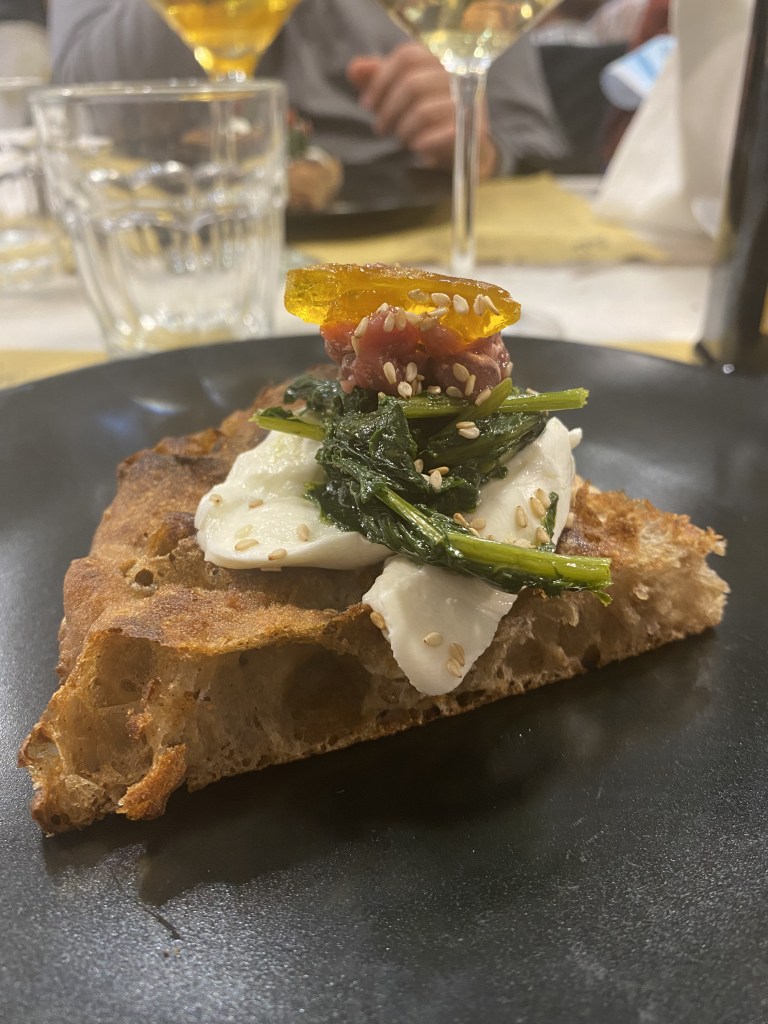 La brevissima fase lag si annienta con la Bufalo Casertano. Volo pindarico da cineteca. Impasto ai cereali tripla cottura. Mozzarella di bufala a fette, tartare di bufalo mediterraneo italiano, broccoli neri, tuorlo d’uovo marinato, semi di sesamo, olio evo. Crunch da dipendenza, mescolanza viva di percussione al palato. Dolce, amaro, saporito, umami e poi ancora crunch, e si riparte. Mangiarla è come fermarsi davanti ad un capolavoro in un museo. Sindrome di Stendhal. Eletto a pieni voti signature dish!