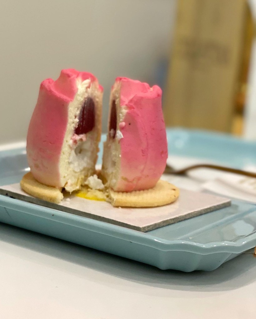 La Pavlova ha le sembianze di una rosa perenne: mousse cioccolato bianco e vaniglia del Madagascar, gelè di lampone, meringa e sablè alle mandorle. Avvolgente nelle note e nelle pause, cremosità eterea priva di eccessi, dolce e profumata, cuore acidulo e allegra croccantezza. Una ballerina che danza leggiadra, vibra verso l’alto e atterra dolcemente al palato. Applausi scroscianti.