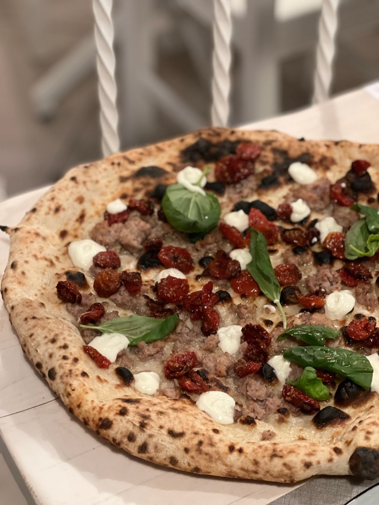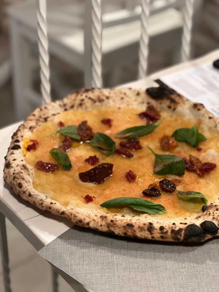 L’equilibro perfetto vince nella Rosso e nero, sempre su impasto 081. Salsiccia di maiale a punta di coltello al brandy, pomodoro confit, fonduta di provolone del Monaco. Gli ingredienti raccontano sapori precisi, definiti che spiegano la bellezza dello stare insieme. Applausi.