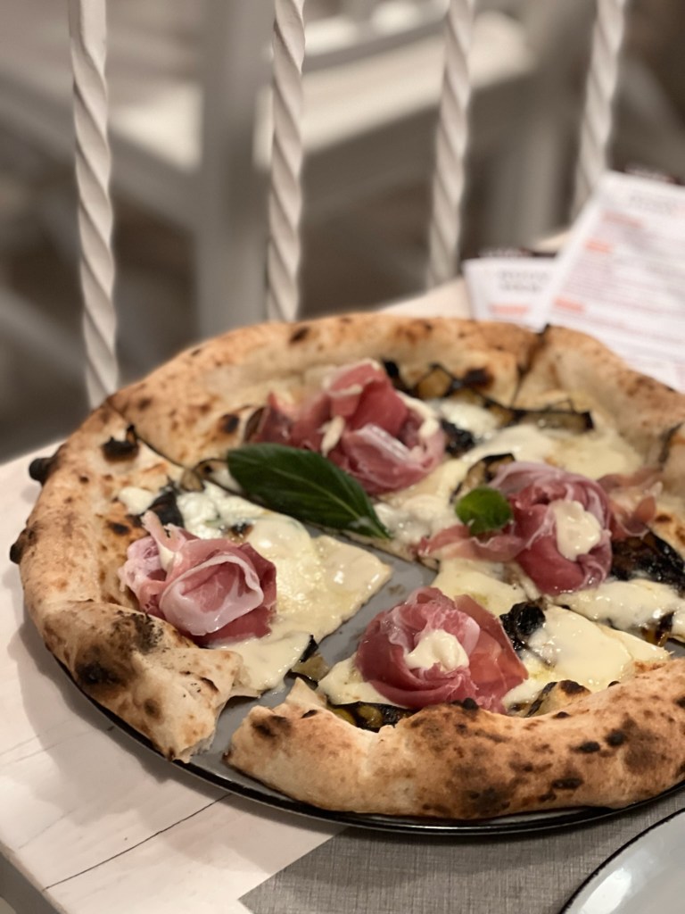 La morbidezza si erudisce con la cremosità del gorgonzola al mascarpone, la dolcezza del crudo San Daniele e l’umami delle melanzane grigliate. La Gorgonzola e crudo è un classicismo che mette d’accordo. Raffinata.