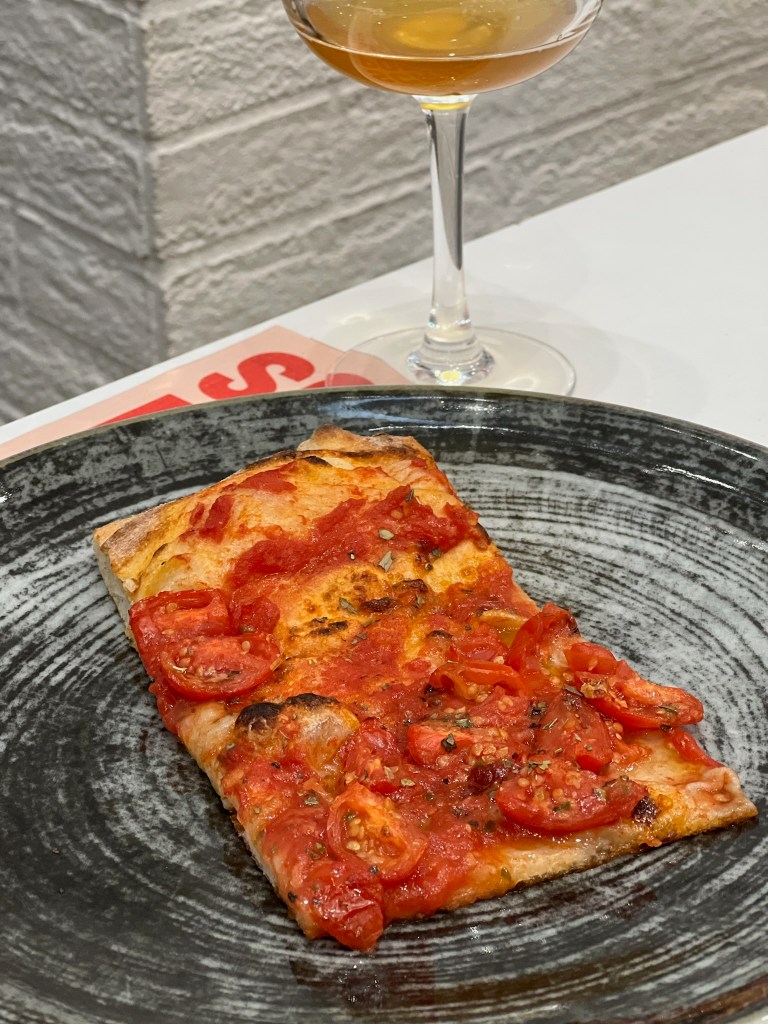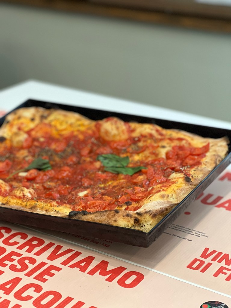 Un impasto, una pizza libera. Da sovrastrutture, confini spaziali, temporali. Libera di cercare gusto, consistenza, piacevolezza, emozione. Una teglia, dieci pezzi di grazia rettangolare.