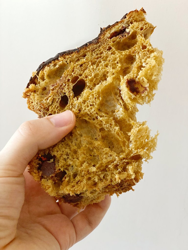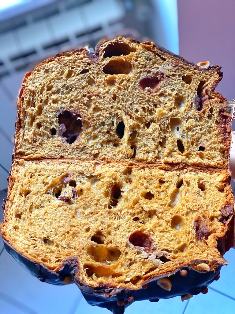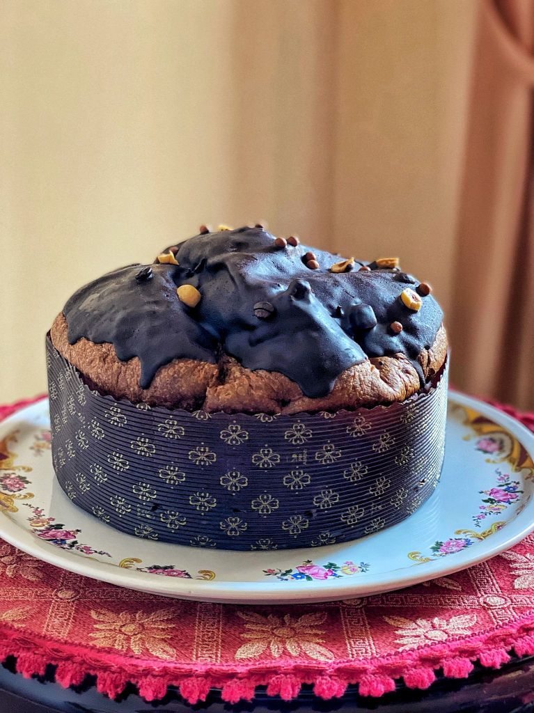Basso e gonfio, alveolato al punto giusto e filante, pasta bella colorata e profumata di caffè espresso. Abbondanza di gradienti di gianduia fondente e sulla cupola una caterva di glassa fondente, che alza il tiro in goduria.