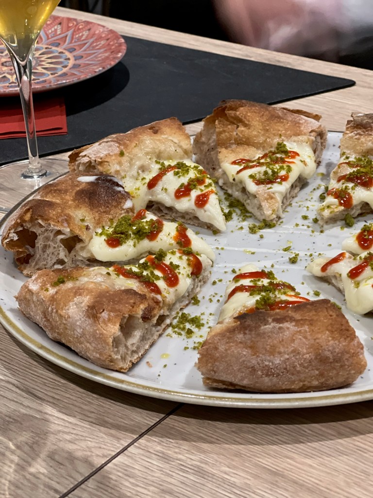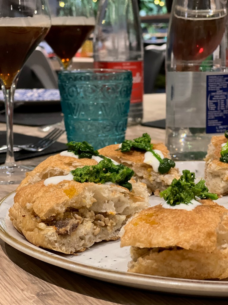 Infine, la teglia dimostra che la formula della felicità non passa sempre dai soliti cliché: friarielli saltati all’aceto di mele, stracciata affumicata, tartare di salsiccia di suino umbro, polvere di friarielli. Infiniti piccoli dettagli. Concetto da bistrot, da fine dining o da pizzeria moderna? Le categorie non hanno senso.