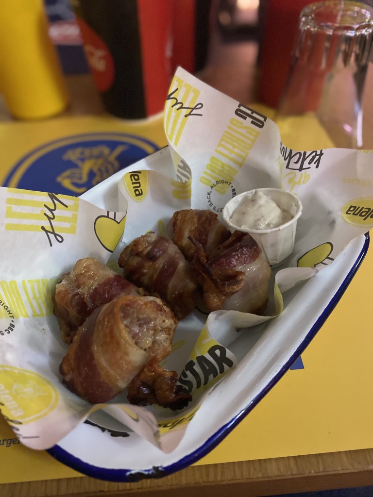 Le fritte polpette di pulled pork servite con salsa Lelena e pepite di salsiccia braciate avvolte nel bacon.