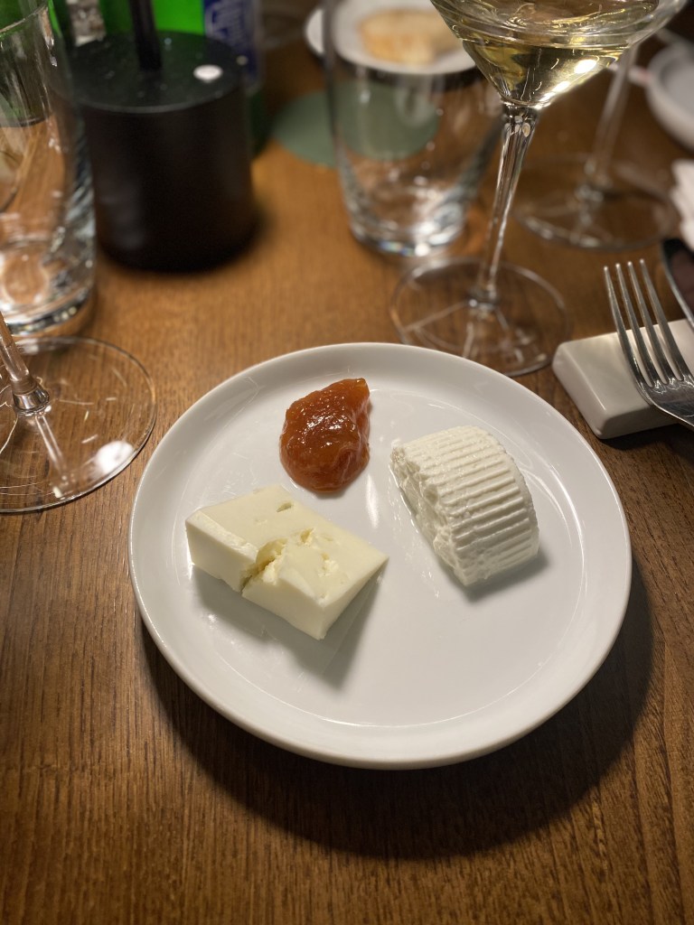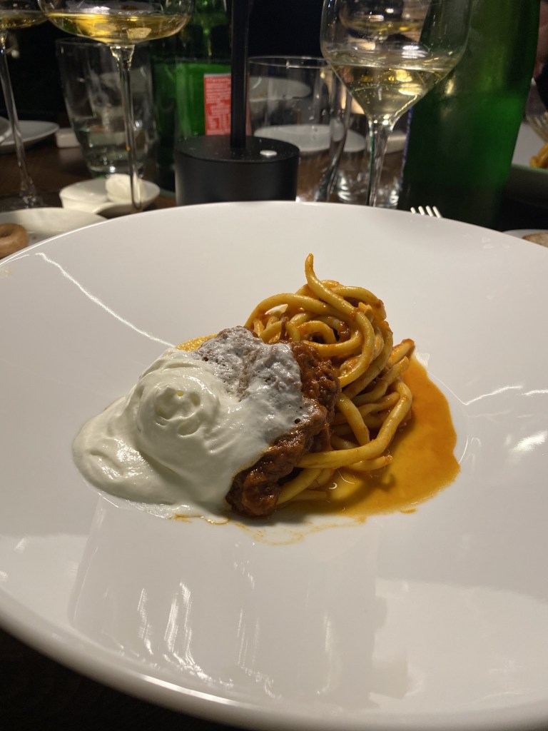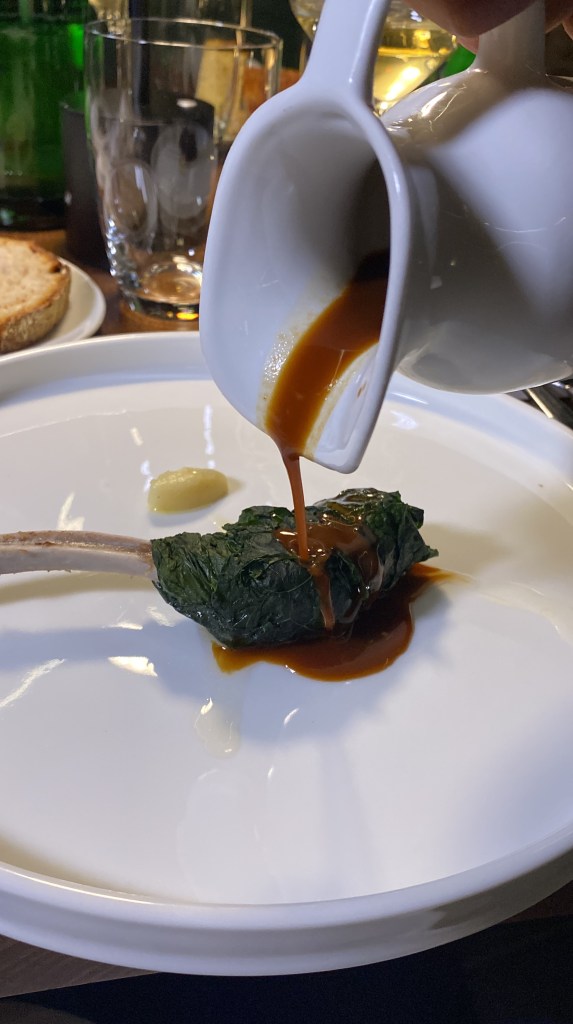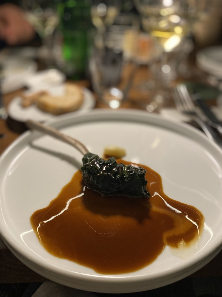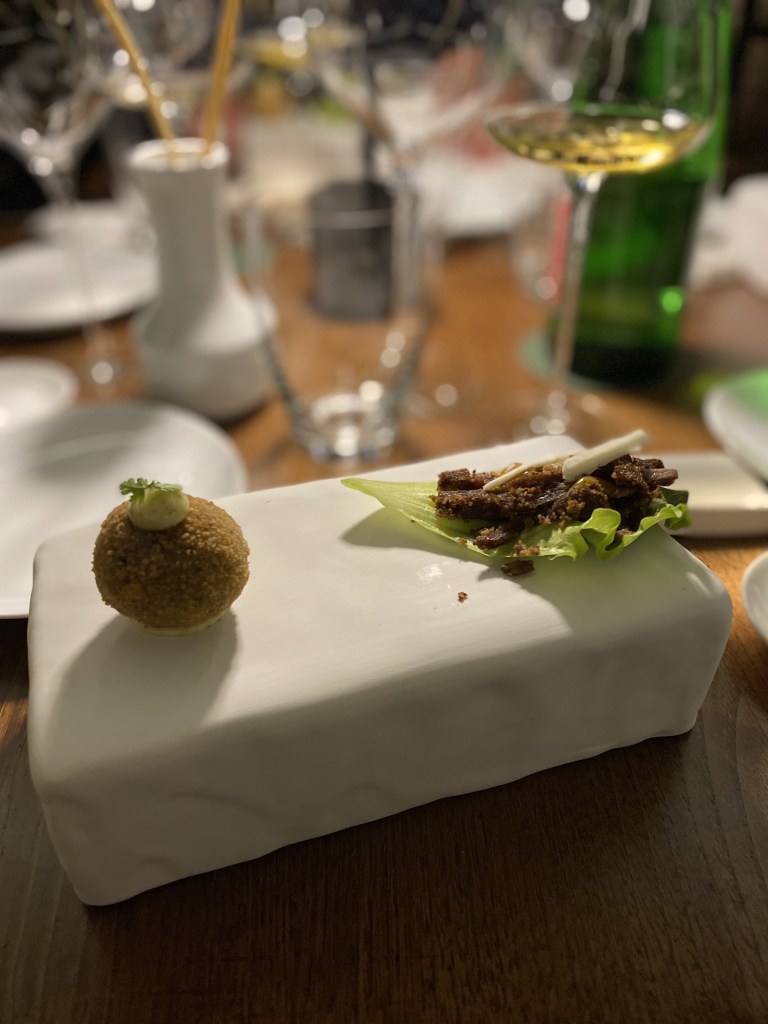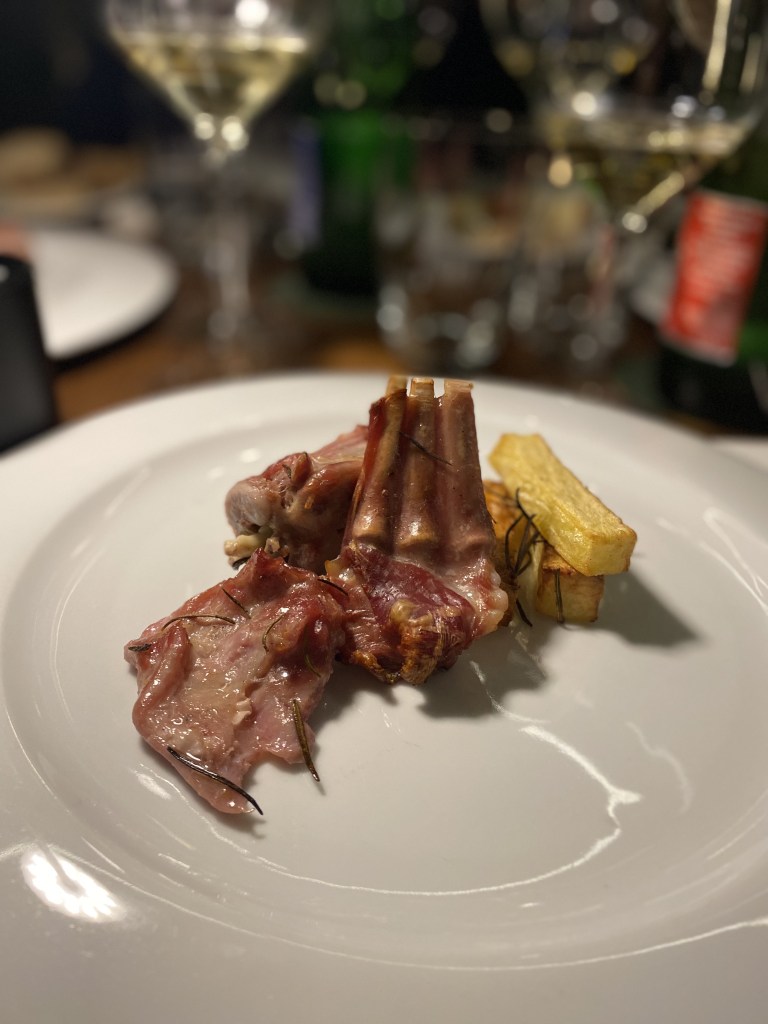 Gli entrée stuzzicano, vibrano e introducono il climax della serata… Polpetta di cacio e stracotto di capra vecchia con maionese al timo e limone, da un lato e foglia di lattuga stile tacos che abbraccia cotolette (a straccetti) di lombatina di capra con cacio, pomodoro e aceto aromatizzato, dall’altro. Il bovide non scherza: sapori e odori decisi che esplodono immantinente. Pietrafumante Brut 2019 e Munazei Bianco 2021 egregi sul fritto.