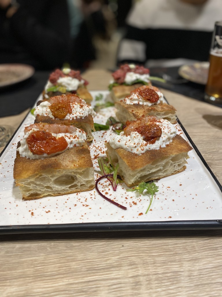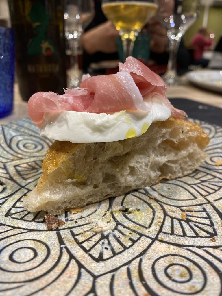 – la Burrata e Gambero Rosso, con pomodorini semi dried, polvere di pomodoro, germogli, olio evo, botticelliana, manifesto di splendore totale;
