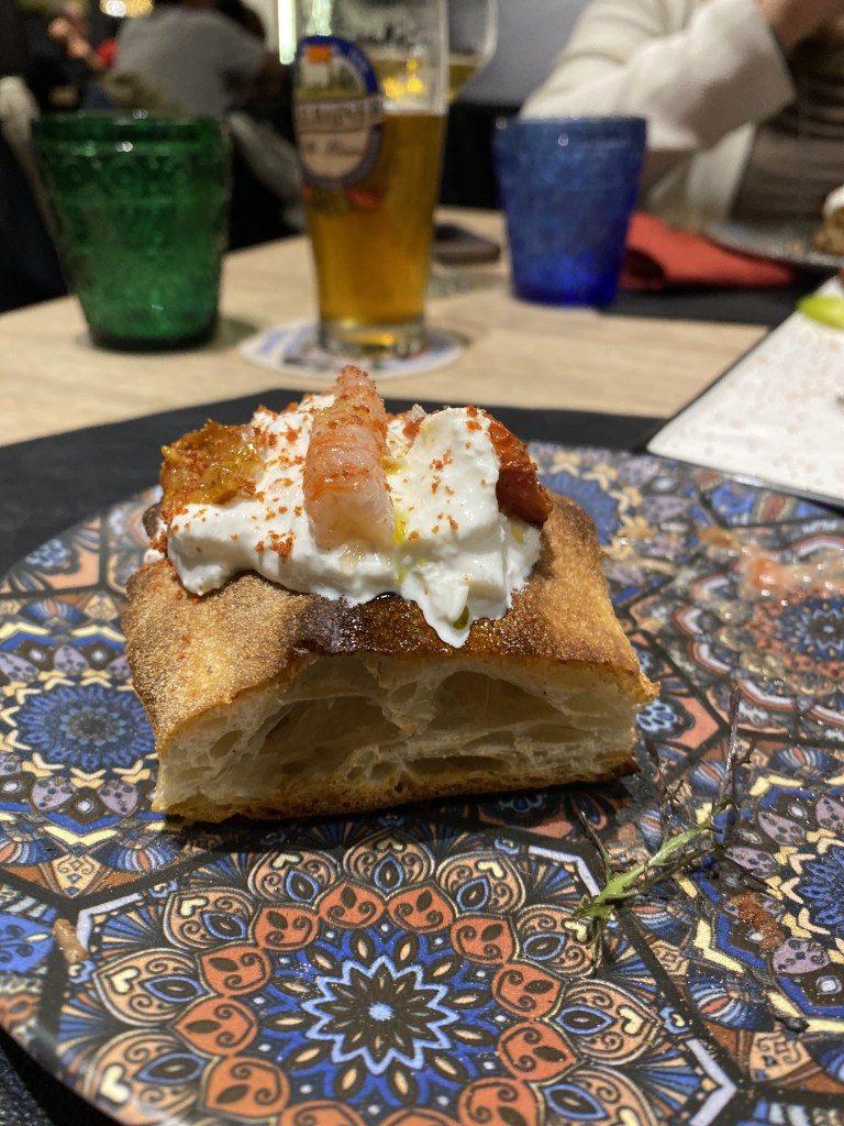 In “pala magna”, mi autocito, ritorna il super crunch Mirabilis. Forma rettangolare 100 x 30 cm, elettrica. Volute scelte luculliane, ruspanti, caciare dal crunch anche di gusto. Crema di ricotta di bufala, salame napoletano, fiori di zucca, provola di Agerola da una parte, porchetta di Ariccia IGP, provola di bufala, patate al forno, melanzane a funghetto dall’altra. Batterie speculari per il cuore, elogio del buono.