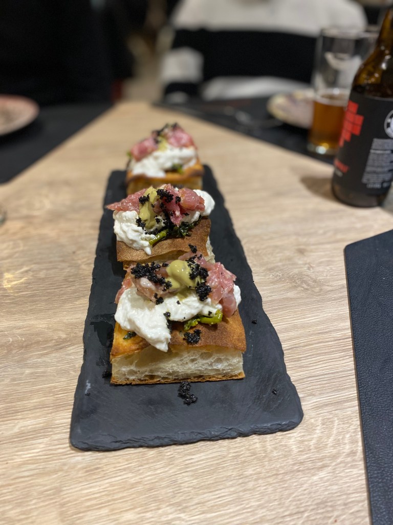 – la Salsicce e Friarielli, all’aceto di mele, stracciata affumicata, tartare di secreto di maiale iberico, maionese di friarielli piccante, polvere di friarielli bruciata, picassiana, cubismo futurista. Da afferrare con le mani e stringerle forte a sé! Misticismo…