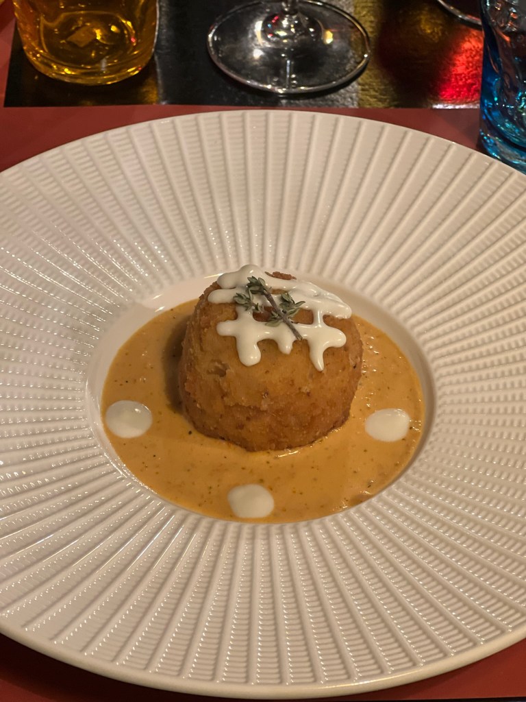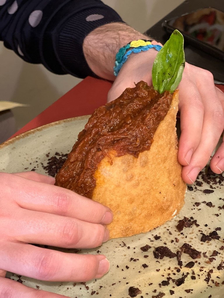 Come il fritto, extra dry. Ed extra iconic. A vocca r’o Vesuvio. Un mezzo calzone rovesciato e spuntato che nasconde una morbida crema di ricotta di fuscella aromatizzata con pepe nero, che erutta ragù napoletano (Deo gratias!) come lava incandescente su briciole di olive nere disidratate a riprodurre i lapilli di cenere. Doratura 24K, morbida e croccante. Scenografico e goloso. Odore della nostra terra.