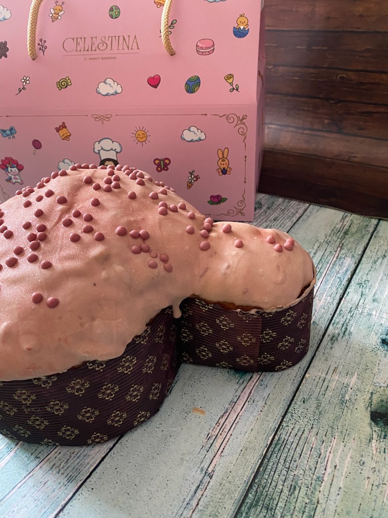 Un vero lievitato d’autore. Segni particolari? Ingredienti di altissima qualità, farina, lievito naturale fresco, burro francese, uova fresche, pregiata vaniglia bourbon del Madagascar. Glassa vanitosa e glitterata con cioccolato Inspiration Framboise Valrhona e cerealini ruby.