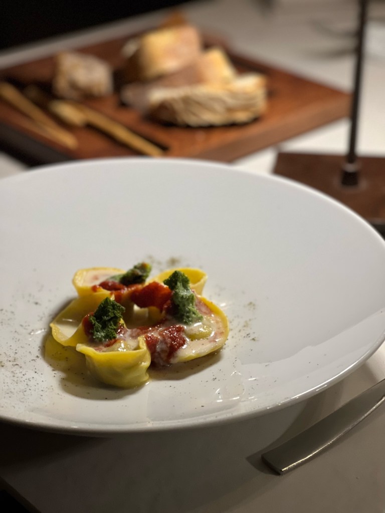 Il tortello di pasta all’uovo ripieno di melanzane con sugo ristretto e fonduta di cacioricotta racconta la Sicilia. Sfoglia sottile che abbraccia e permette di godere appieno della farcitura leggiadramente sapida e voluttuosa. Applausi.