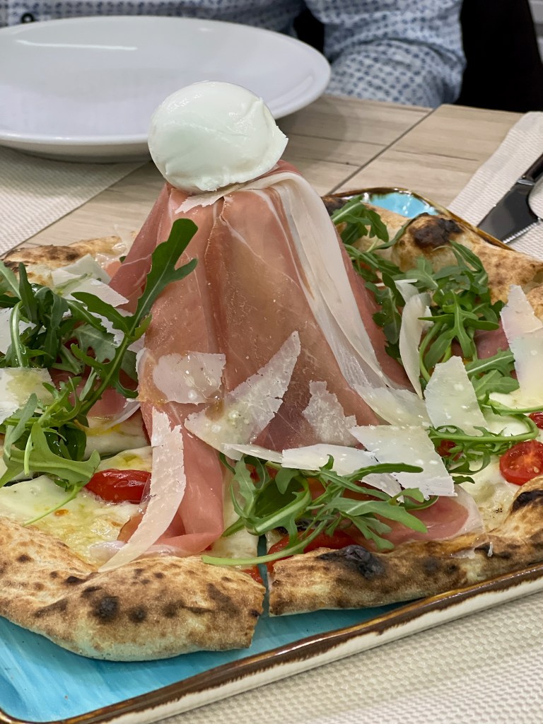 Effetti speciali per iniziare. Scenografica e goliardica, con quel tocco di vintage che può adulare. La Vesuvio rappresenta il vulcano nelle vesti di San Daniele Gran Riserva 20 mesi affettato al momento, base di fiordilatte d’Agerola, pomodoro datterino, rucola, scaglie di Parmigiano Reggiano, bocconcino di bufala come cratere. Il sodalizio classico dove la qualità degli ingredienti è la parte vincente.