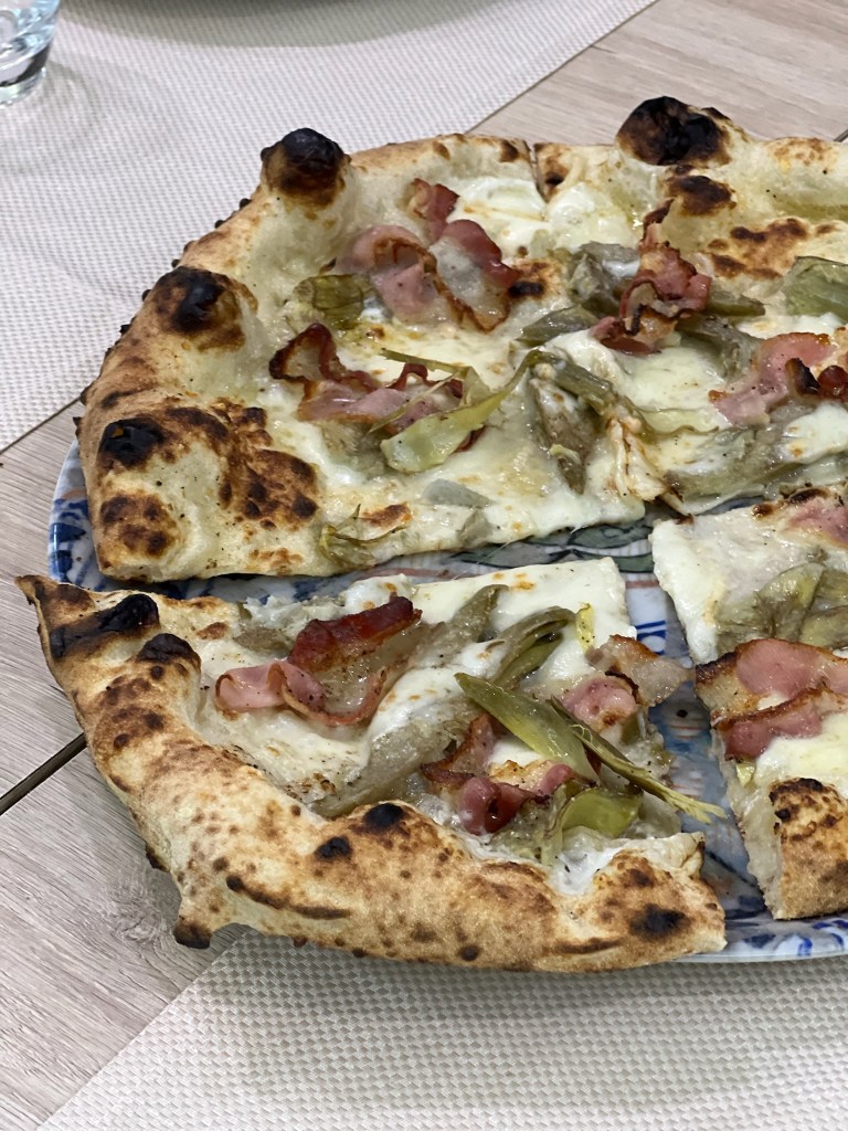 La Carciofi grida di gusto. La dolcezza del cuore di carciofo fresco a Km 0 mista al fiordilatte d’Agerola incontra la sapidità speziata della pancetta paesana; formaggio e pepe aggiungono lo zing. La base qui tende al crunch estremo che aggiunge una certa piacevolezza al morso.