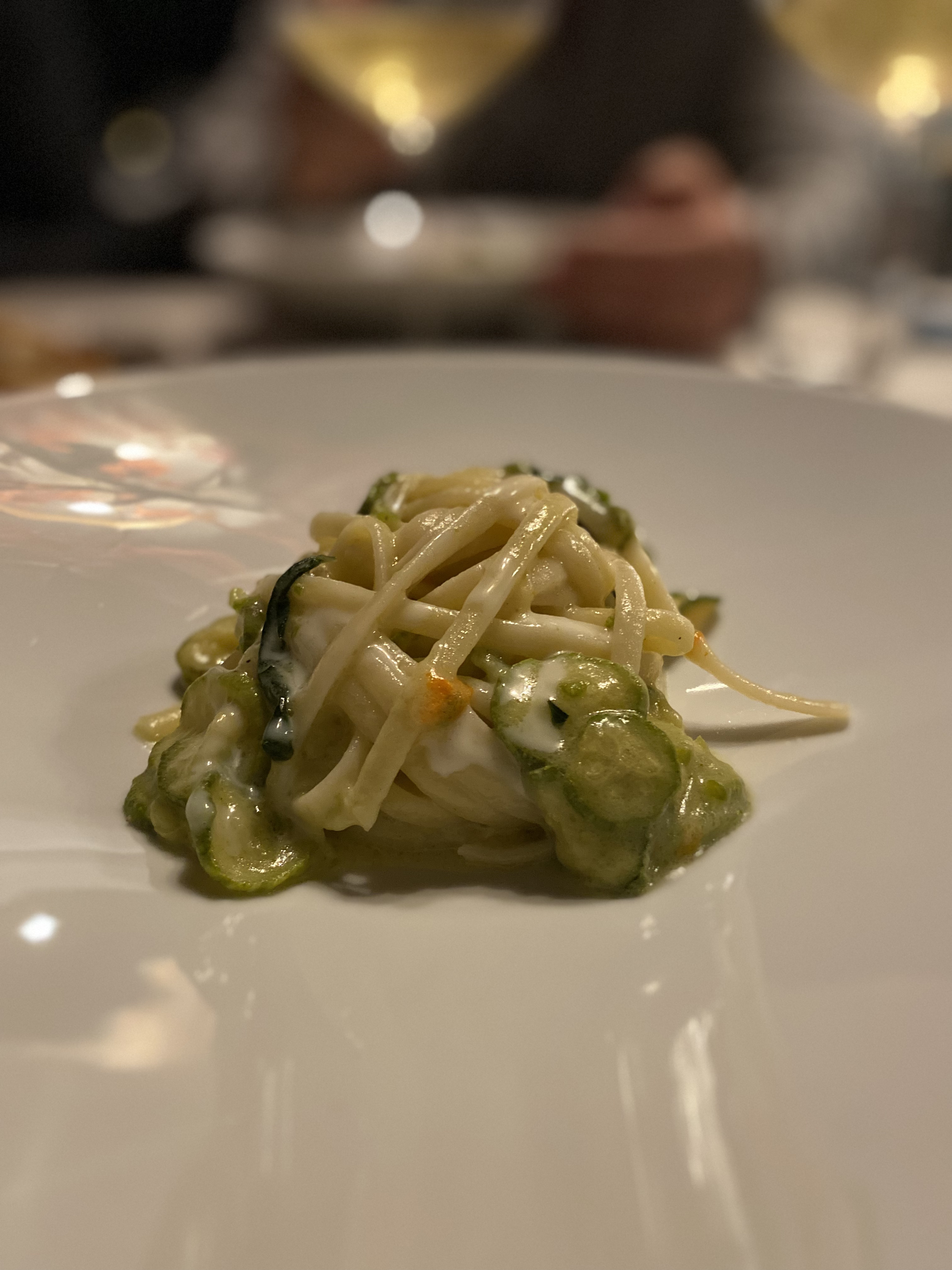 Il Provolone del Monaco? Con la Nerano, e con chi se no… Linguine vive di cremosità spinta e giocosità della chips di zucchine.