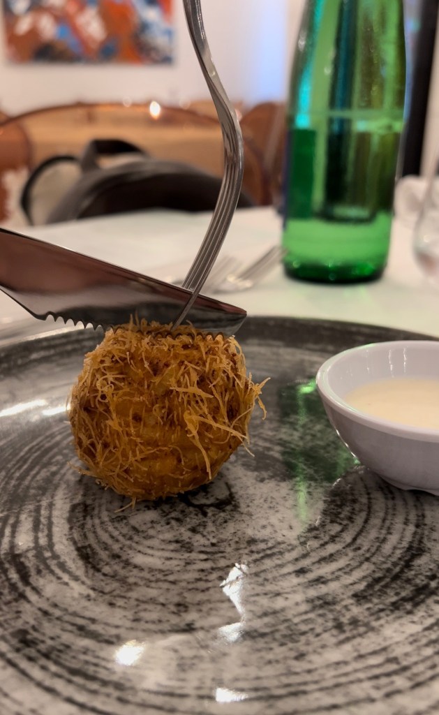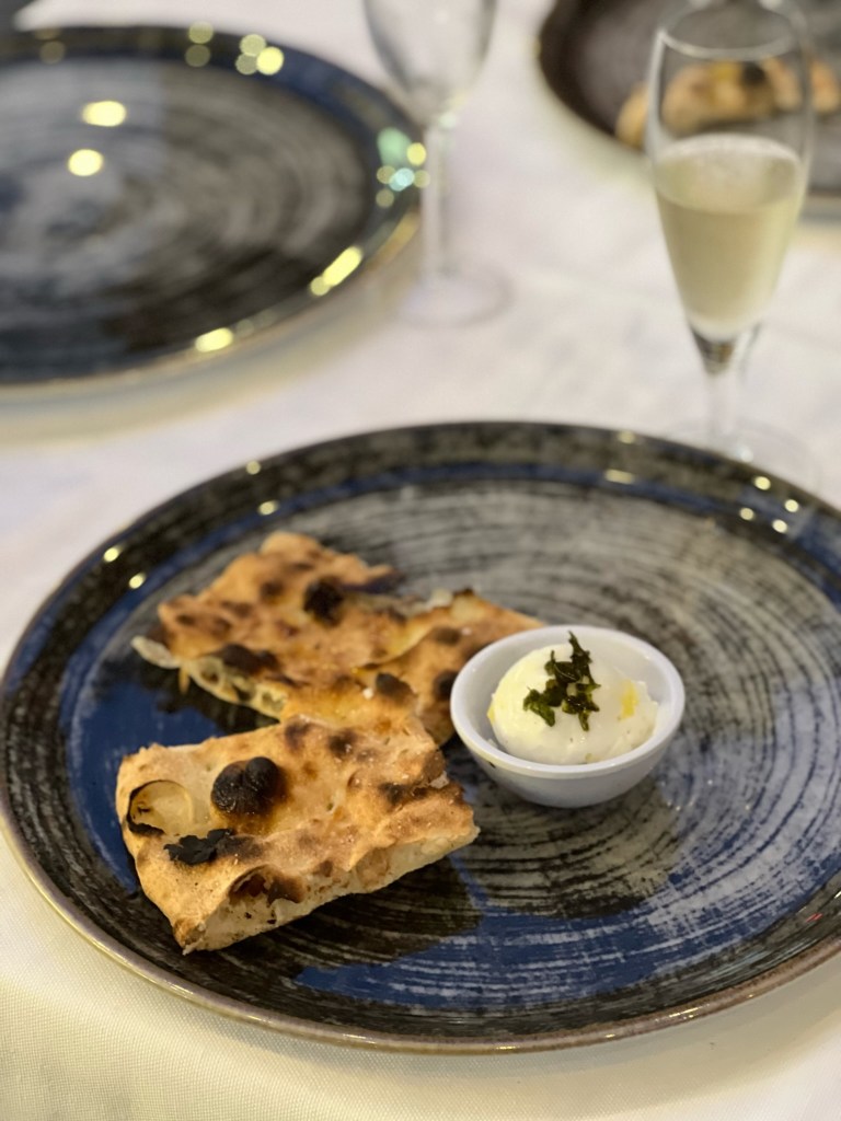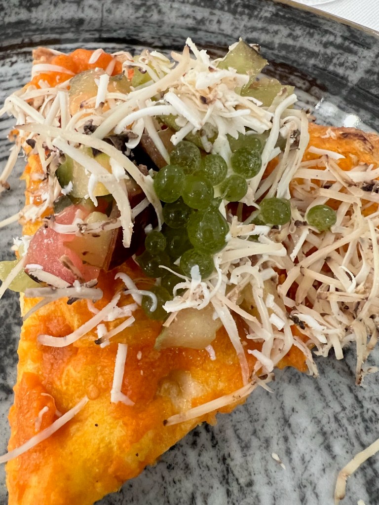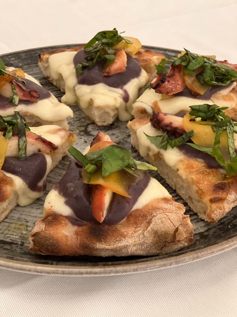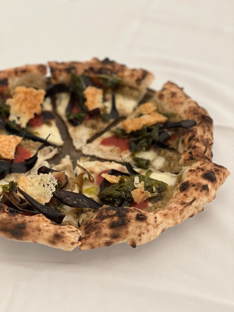 Il padellino è nella versione Purple: fiordilatte, crema di patate viola agli agrumi, ranfe di polpo cbt alla piastra, pesche percoche all’asprinio, olio evo e basilico. Poi la fritta e al forno rivive di uno Scarpiello secondo Enzo. Un mix di sapori 2.0 per niente vintage: base crunch, ragù di pomodori dattalo che da spessore, brunoise di pomodoro nero che allunga in croccantezza, Nero del Montale a scaglie tra dolcezza e acidità, freschezza di caviale di basilico e pepe di Cayenna.