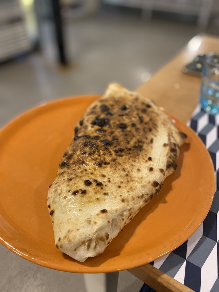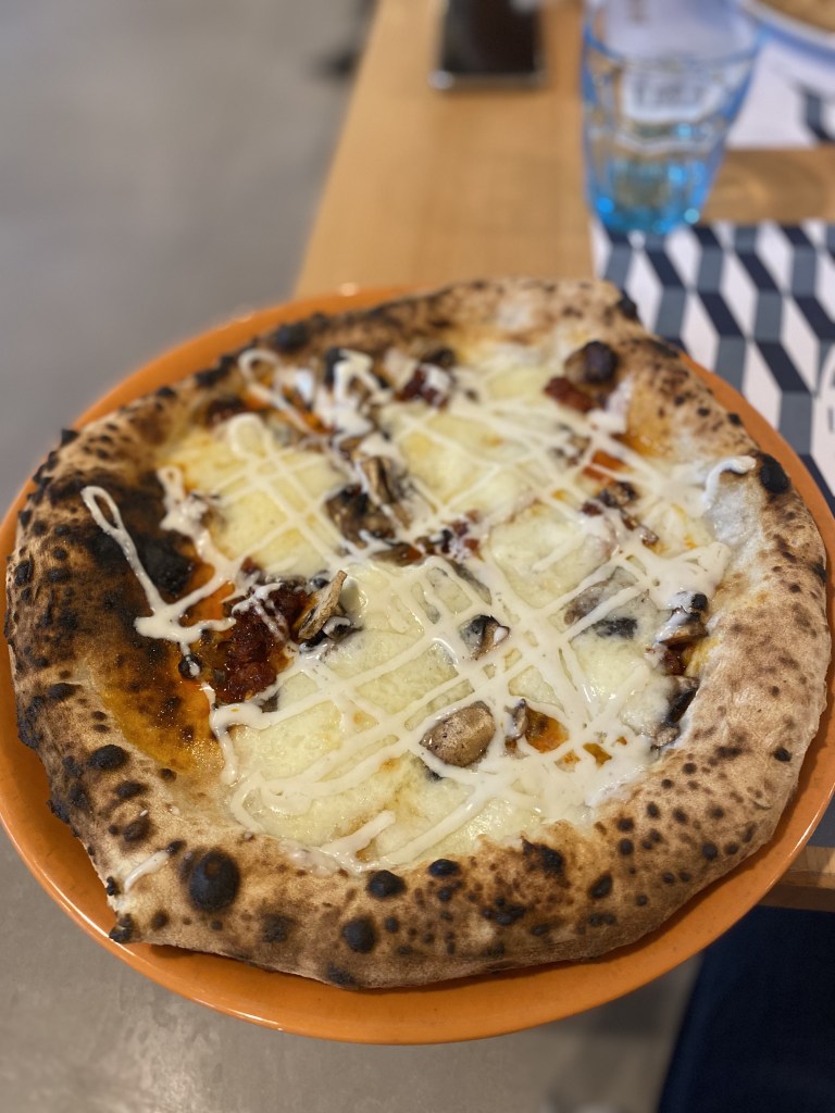 La Gocce di Memoria è la scelta più estroversa. Mash up moderno ma non troppo: mozzarella di bufala, funghi champignon, nduja, fonduta di gorgonzola. Peccato per quella zona d’ombra (piccola bruciacchiatura in un lato, ahimè!) che ha bruciato la lode. Topping in equilibrio dinamico con la sofficità dell’impasto: i funghi croccano e donano sapidità, la nduja accende in maestosa piccantezza e la fonduta spegne e arrotonda in aromaticità e dolcezza. Dosaggio perfetto, mano fine. Dettagli da piccoli attimi di felicità.