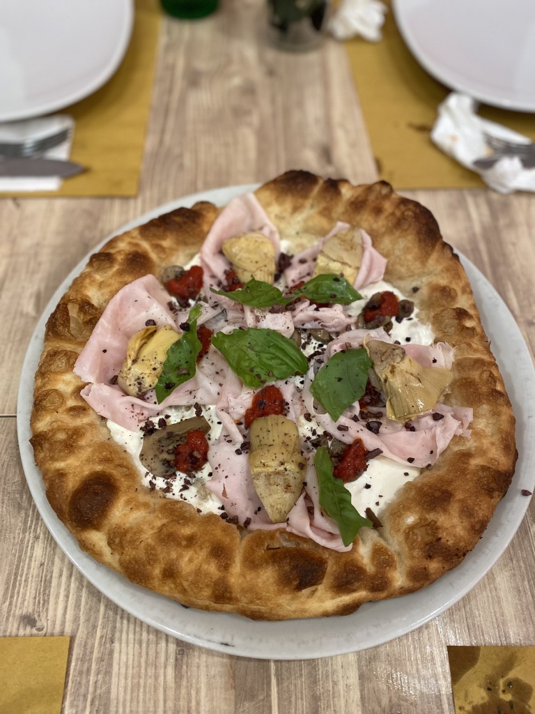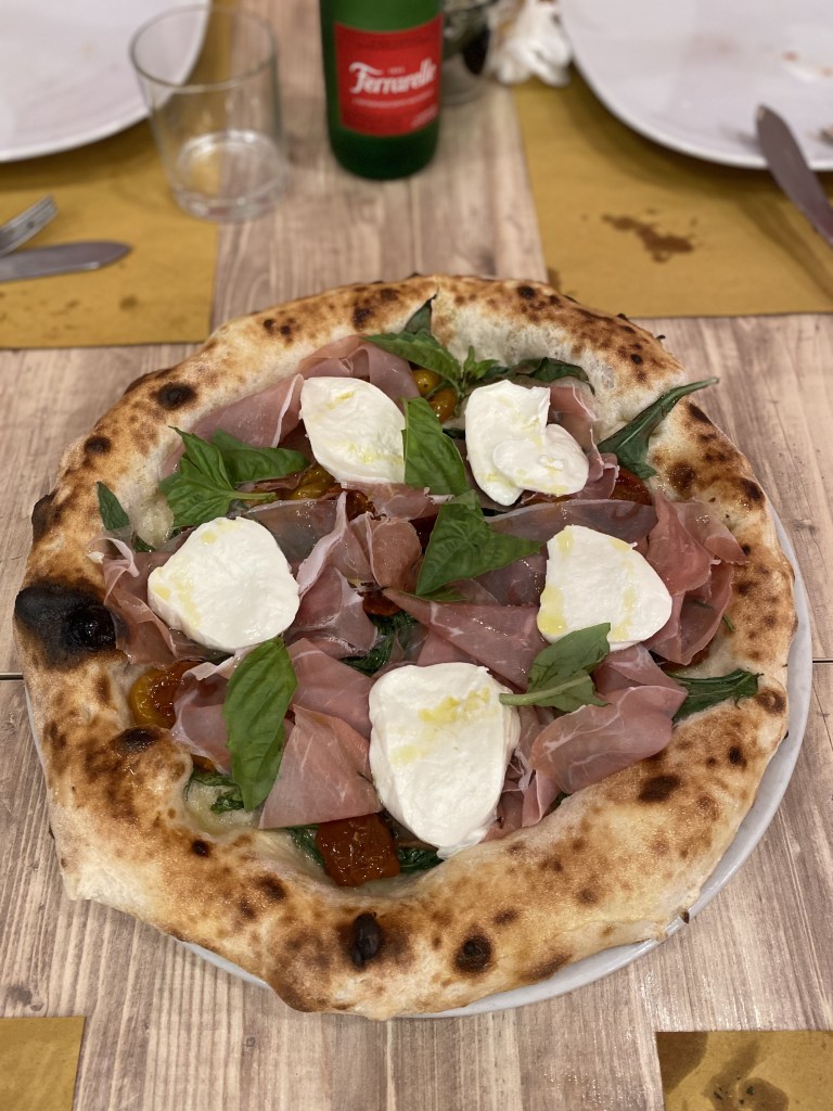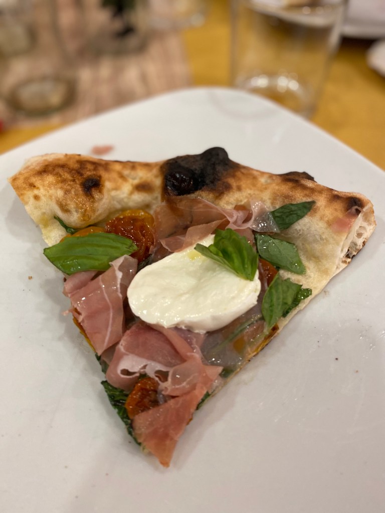 La Estate a modio mio stupisce. Interessante melting point per un’idea di base rigenerata: base di rucola selvatica, pomodori rossi e gialli arrosto e grana in cottura; in uscita crudo, bufala, tanto basilico, evo e origano. L’impasto si esprime al meglio, in un gioco senza frontiere con ciò che contiene. Amaro, dolce, poi salato, poi ancora amaro, dolce e acido. Applausi sinceri.