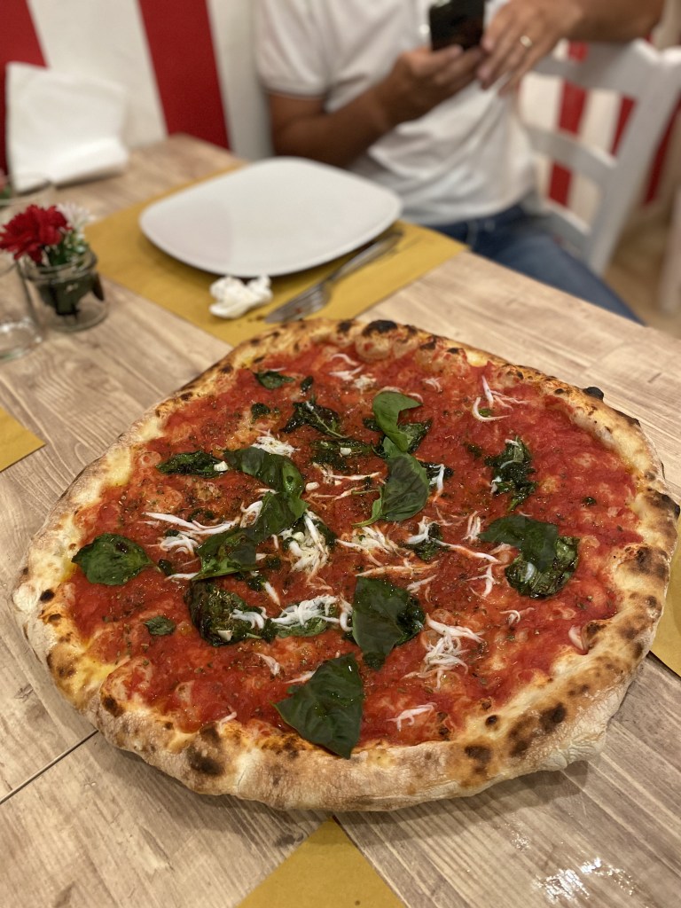 Ruota di carro, sì, ma scenografica. Outside e non inside. Due dita di raggio fuori dal piatto. Non è “quella là”, sia chiaro, qualche angolo va smussato, ma ingredienti superbi, sia per la Margherita che per la Marinara, antica con i bianchetti. Incontri romantici.