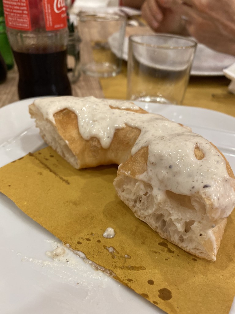 Poi il giuoco, la goliardia, Raffaele l’illusionista: Ecce graffa! Dopo sole due proposte il dolce è prematuro. Ciambella salata con crema cacio e pepe. Soffice e dorata, più buona che simpatica. Un soffio fritto dalla superficie salata.