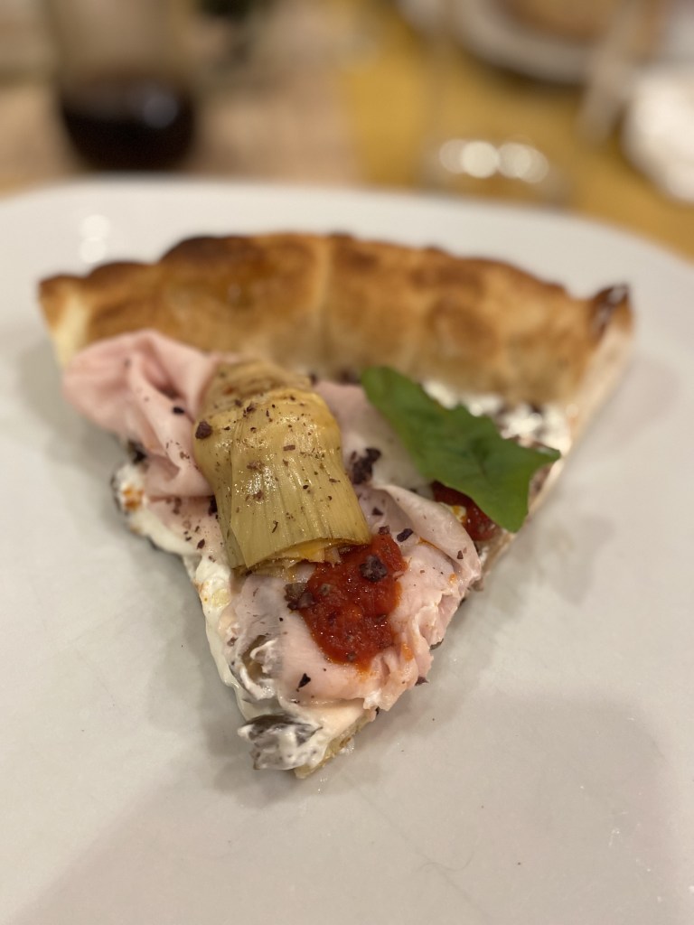 In loco il famoso trittico delle cotture si palesa. Realizzazione magistrale, crunch & dry. Base ammaliante per la Cenerentola delle pizze vestita per l’occasione con l’abito della festa: acqua di provola e funghi champignon in cottura; all’uscita prosciutto cotto al ginepro, polvere di olive, concentrato di pomodoro arrosto, carciofini sott’olio. La Capricciosa a modo mio svela la passione per l’equilibrio, la ricerca del prodotto di nicchia e la matura consapevolezza. Idilliaca.