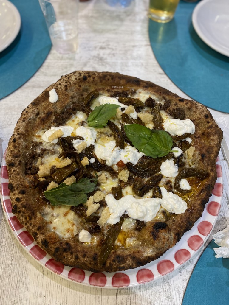 Impasto integrale, nessun integralismo ma con Pepperoncino mood. Peperoncini fritti, fiordilatte e macinato di Scottona; all’uscita burrata pugliese e parmigiano croccante. Rustica e ruspante, con la ciccia che titilla, i latticini che oscillano e i pepper iper fritti che donano ardore. Base persistente, intensa, che sa di grano e di bosco. Promossa.