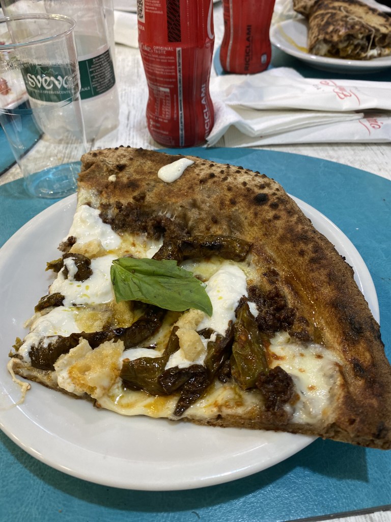 La Partenope gioca con pomodori e consistenze. Accattivato dagli ingredienti: passata di datterino giallo della Piana del Sele, fiordilatte; all’uscita crema di pomodoro del piennolo vesuviano scottato, parmigiano verde aromatizzato al basilico. Più buona che bella (pensa te!). Dolcezza sibillina, cremosità spinta, contrasto di temperature, picco di acidità e zig zag di croccante freschezza. Una pizza perfetta. Innamorato.