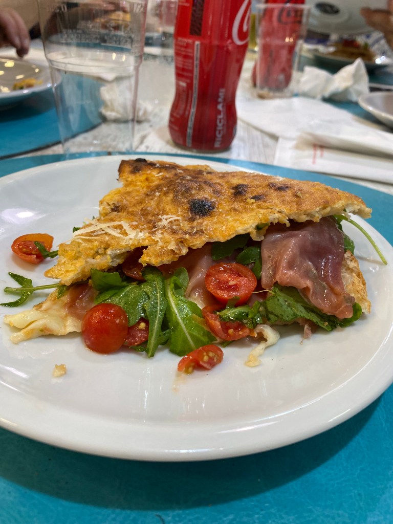 Lezione di vita. Realizzazione magistrale, picchi di bellezza. Freschezza, crunch, sapidità. Trittico immane. Ripieno Primavera, circolare per l’occasione. In cottura un sandwich con il solo fiordilatte e parmigiano in superficie. All’uscita conciatura con prosciutto crudo di Parma, pomodorini datterini siciliani, rucola selvatica. Epifania.