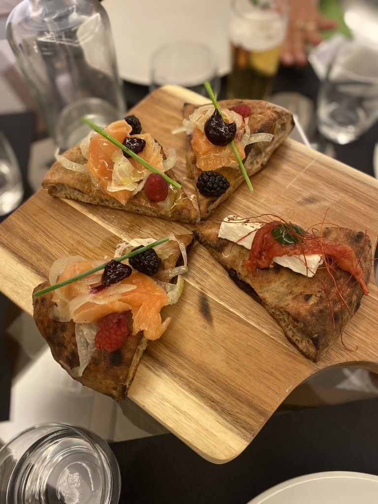 Entrée, a mo di tapas. Finocchio essiccato, salmone, erba cipollina, frutti di bosco. Giocosa nel topping che irradia in freschezza continua e prolungata, tra note acide e croccanti. La base ai sette cereali, eau de grano: aromatica, rustica con crosta croccante e mollica morbida al punto giusto. Warm up allegrissimo!