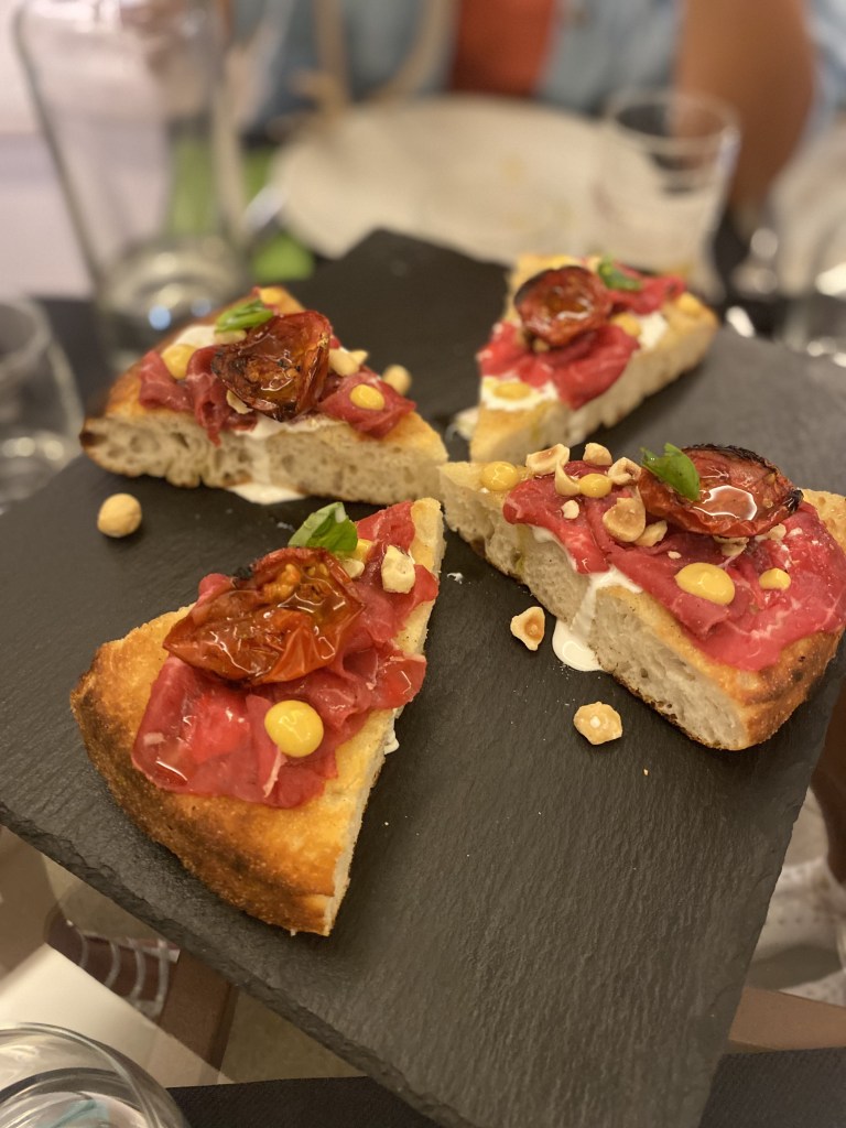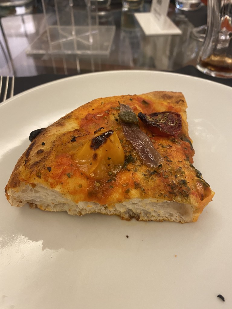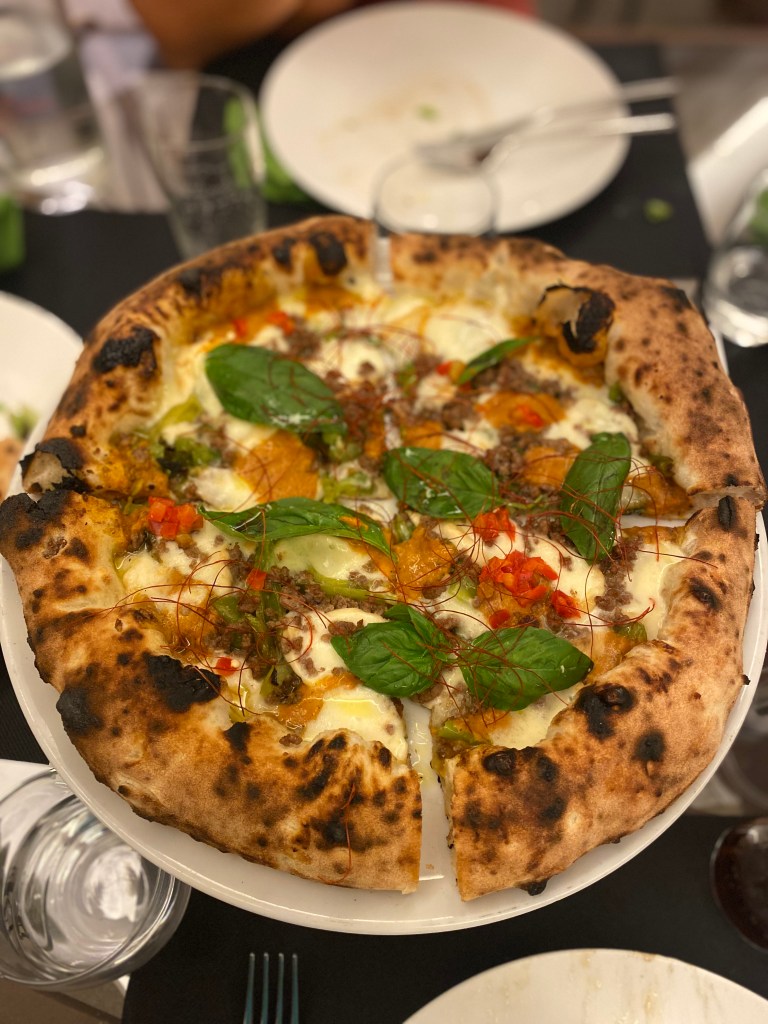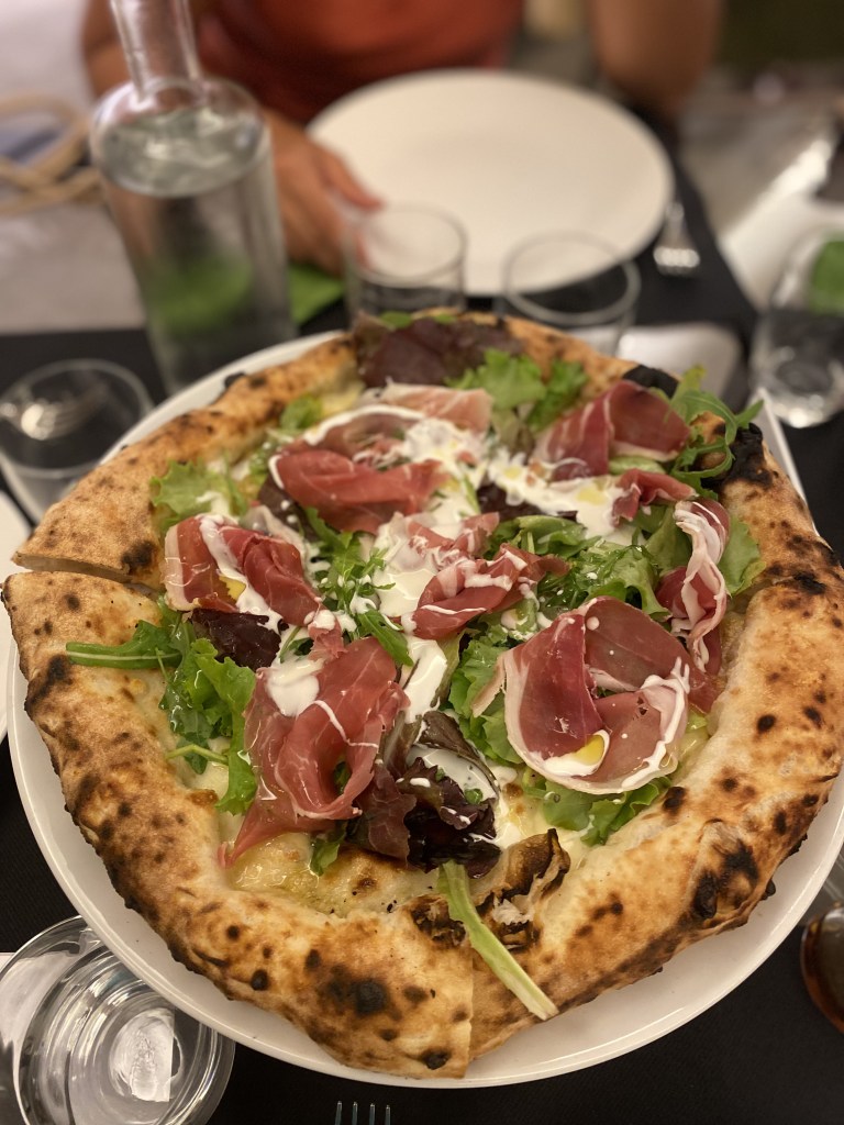Aria di Montagna, quando il prosciutto trova la sua dimensione tra l’erbetta di campo, il fiordilatte d’Agerola e le gocce di bufala al lime. Realizzazioni importanti queste. Sembrano sagomate. Il sincero è bello. Freschezza struggente su un impasto grazioso che scompare al morso. L’estate in bocca senza compromessi.