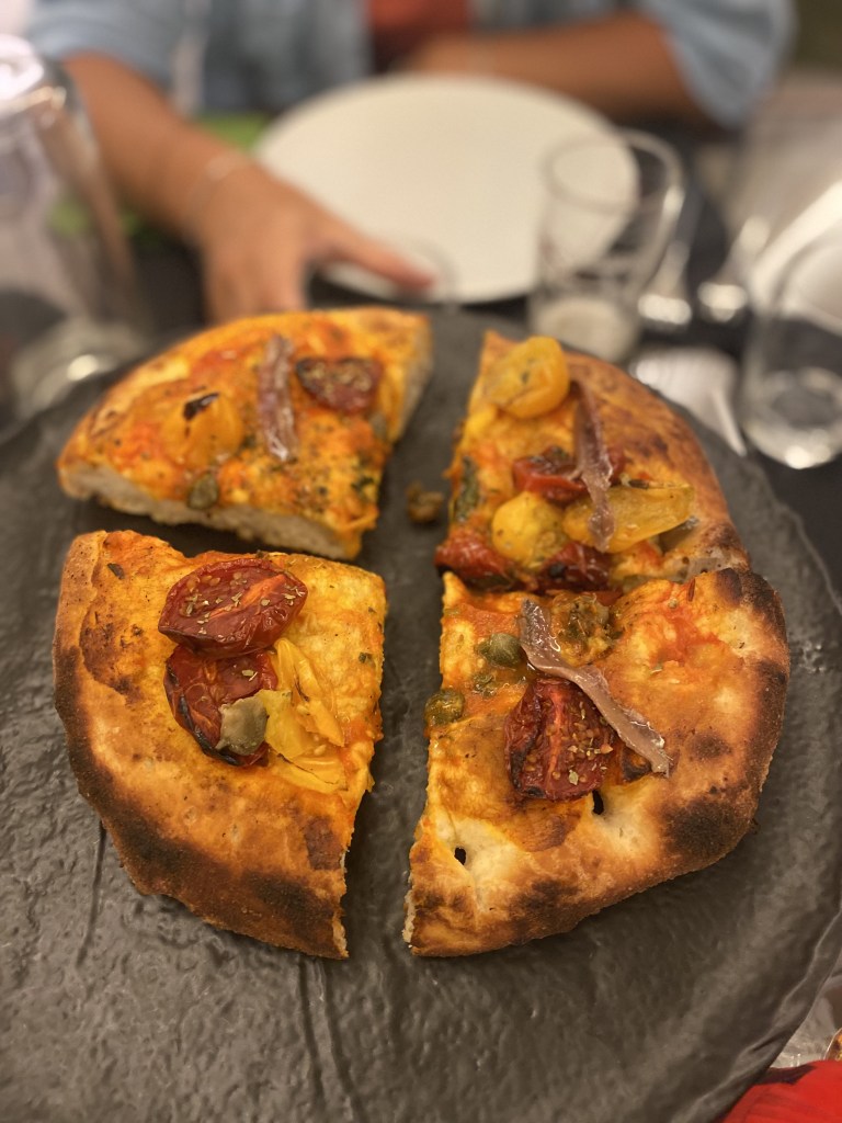 Assaggiare oltre. Oltre la felicità. Oltre la Marinara. La lettura esige l’abbandono di preconcetti e sovrastrutture. Il tris di cotture vapore-fritto-forno adibito al nuovo food trend marinaresco. L’abbrustolito della salsa di pomodoro arrosto, la delicatezza odorosa dell’orsino e dell’origano di collina, la dolcezza e l’acidità dei pomodorini gialli e rossi, l’umami delle acciughe. Un crunch brillante, una leggerezza eterea. Vivacità vivace!